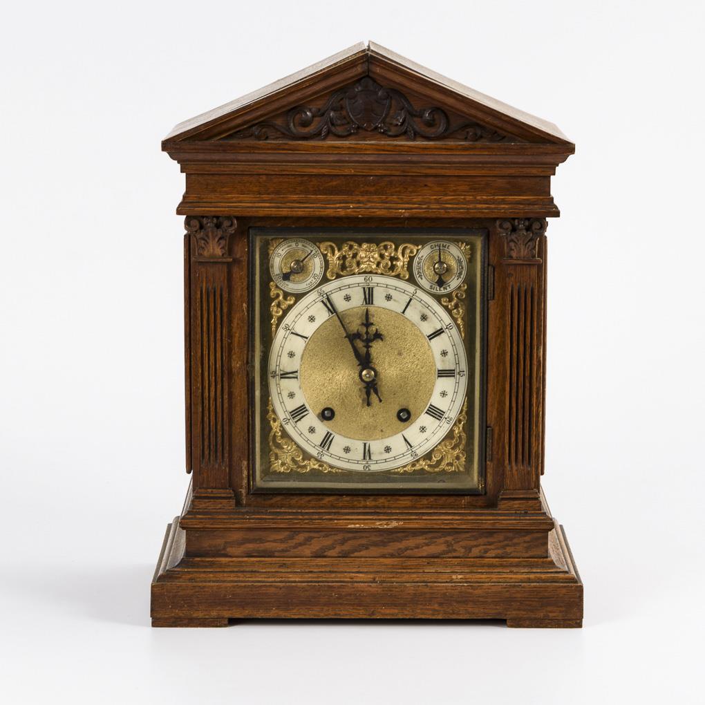 Stutzuhr mit Dreiecksgiebel und historistischem Dekor. Winterhalder & Hofmeier.