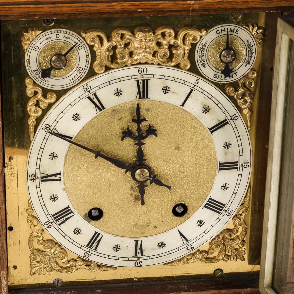 "W&H Sch. 3" gemarktes Werk mit Viertelstundenschlag auf 2 Tonfedern. Läuft, revisionsbedürftig. Messingfront mit versilbertem Zifferring mit römischen und arabischen Zahlen, Minutenkranz und Speerzeigern, in den Zwickeln Hilfsblätter für Regulation und Schlag, florale Bronze-Zierbeschläge.