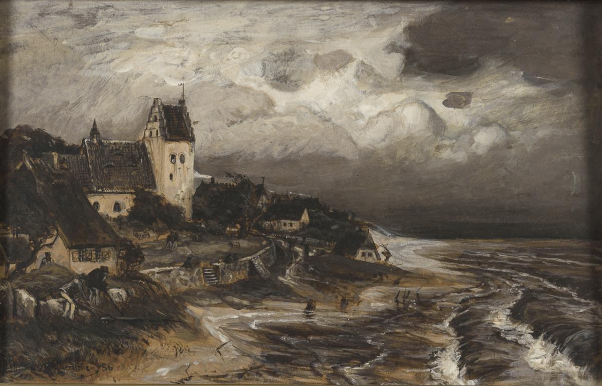 Alter Turm auf einem Waldhügel sowie Küstenlandschaft mit Stadt unter dunklen Wolken.