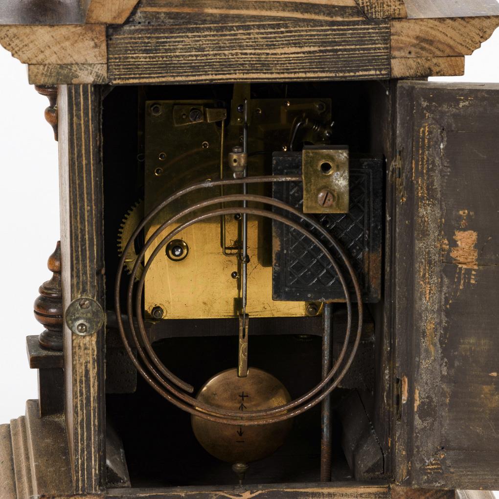 Gemarktes Werk mit Halbstundenschlag auf Rundgong. Läuft an, revisionsbedürftig. Weißes Emailzifferblatt mit römischen Zahlen, Minutenkranz und Stabzeigern.