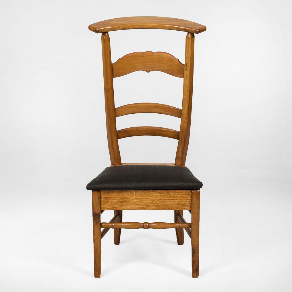 Gepolsterter Kniestuhl mit versprosster Lehne, Armstütze und aufklappbarem Kasten. Alters-/Gebrauchsspuren, restauriert, Bezug ergänzt.