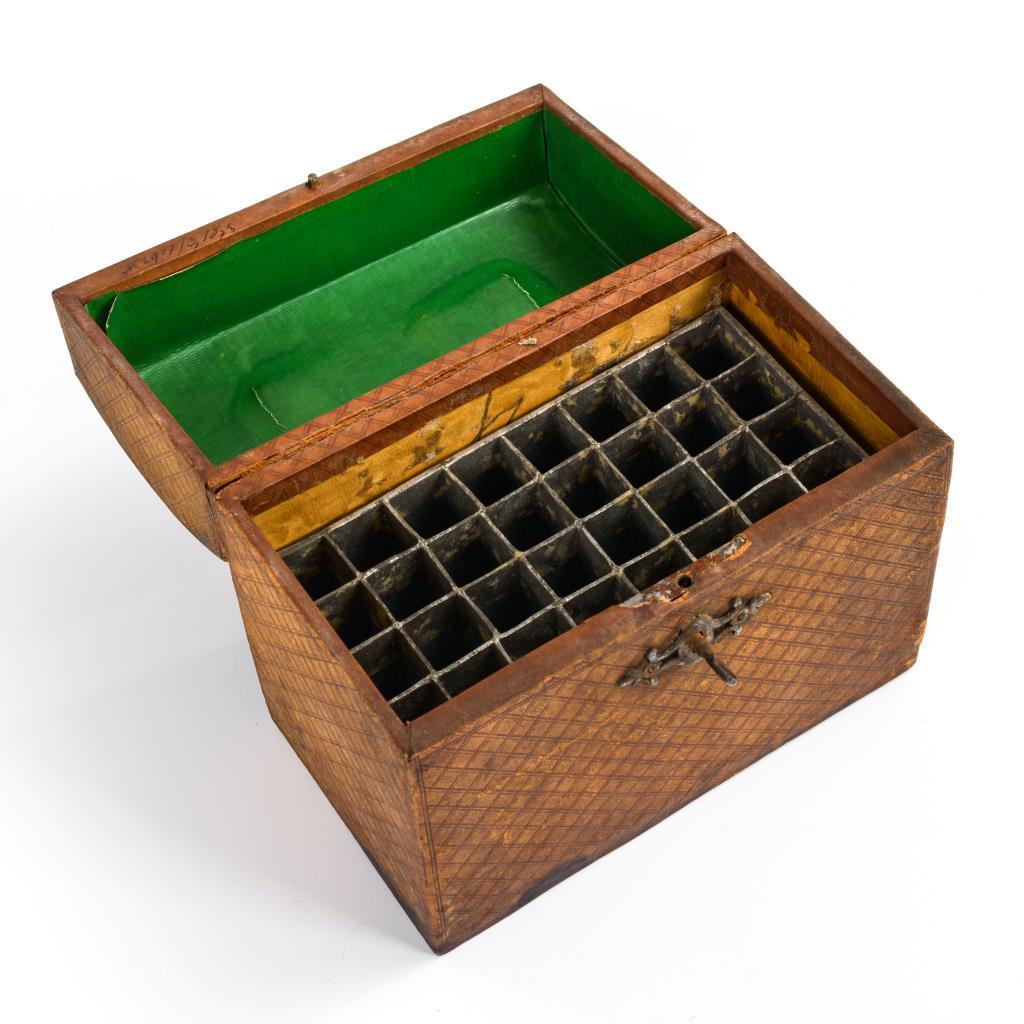 Abschließbare Quadertruhe mit einem Tragegriff auf leicht gewölbtem Scharnierdeckel. Allseits Rautenrapport sowie Anthemion-Rahmung auf dem Deckel. Innen Fachung für 32 Röhrchen. 1 Schlüssel. Scharnier gerissen, starke Alters-/Gebrauchsspuren.