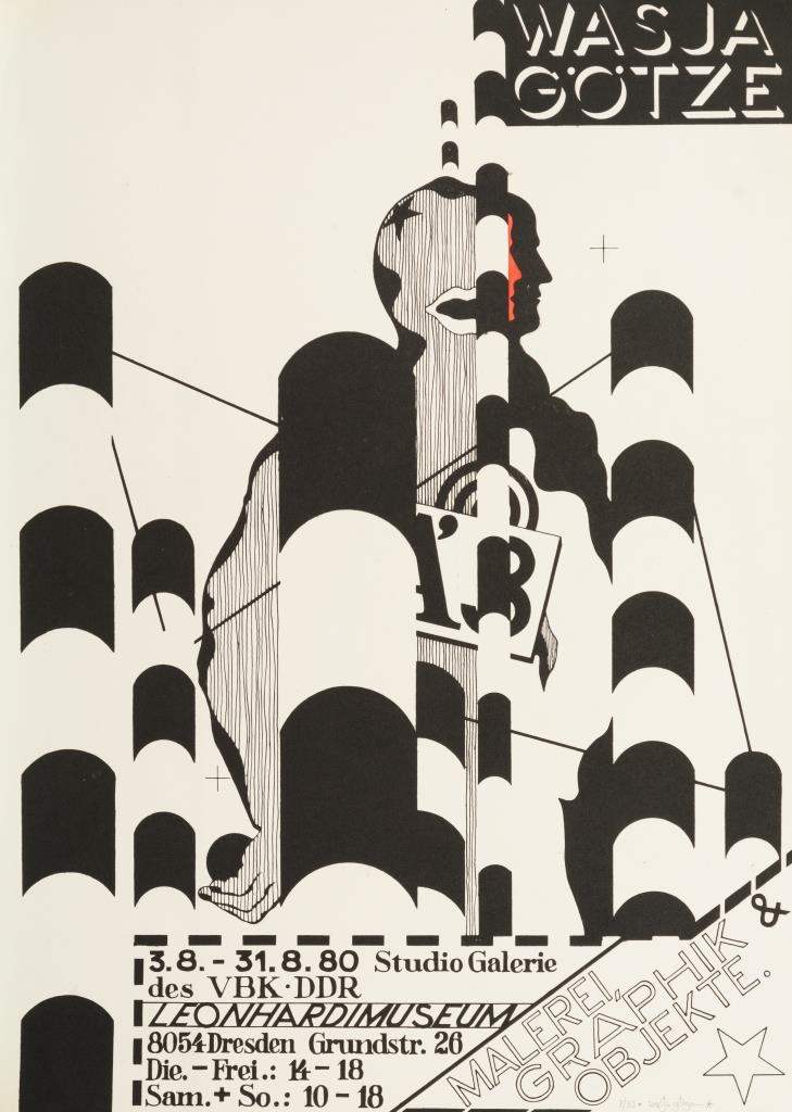 13 Plakate zu Ausstellungen im Leonhardi Museum Dresden: "Claus Weidensdorfer", "Günter Firit", 2x "Lothar Böhme", "Das Meer", "Juryfreie Informationsausstellung [...]", "Makolies", "Kontraste", "Wasja Götze", "Michael Morgner", "Dresdner Kunst heute", "Jürgen Böttcher" und "Eberhard Göschel". Teils an den Rändern geknickt.