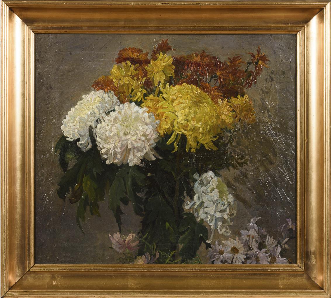 Chrysanthemen und Astern in einem imposanten Strauß vor neutralem Hintergrund. Minimale Altersspuren.
