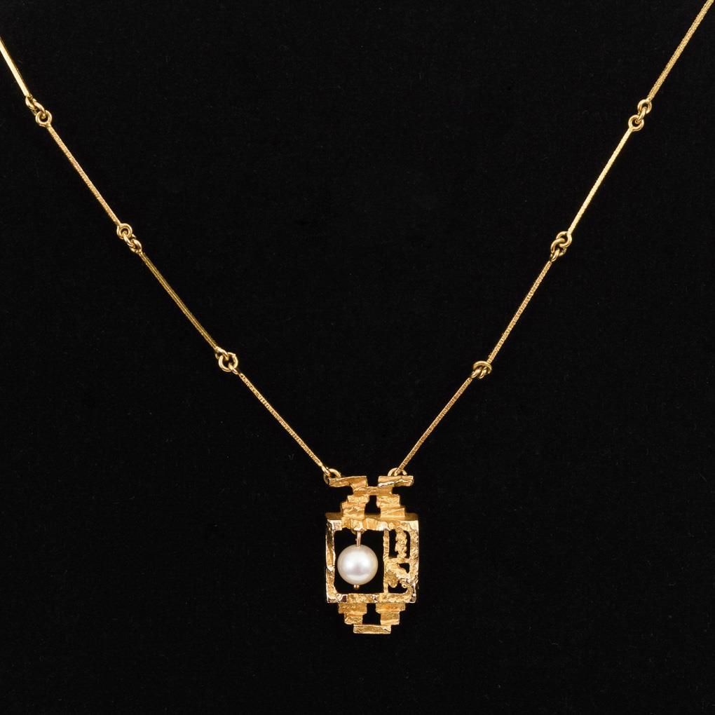 Gelbgold 585 gestempelt. Punzen: Finnland T7 (1972). Anhänger 2,5 x 1,5 cm. Kette L 45 cm. 8,3 g.