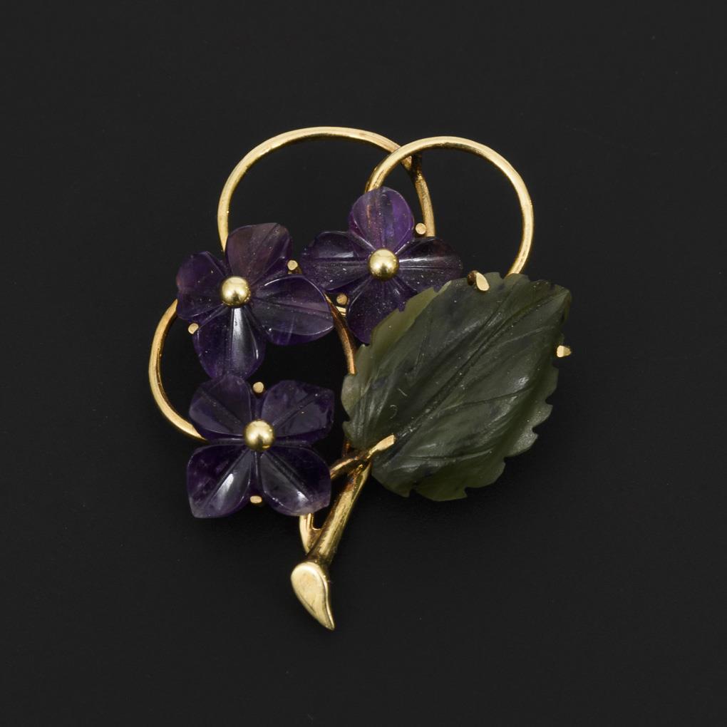 Geschnittenes Jadeblatt und 3 Amethystblüten auf Bogenzier. Kugelhaken.