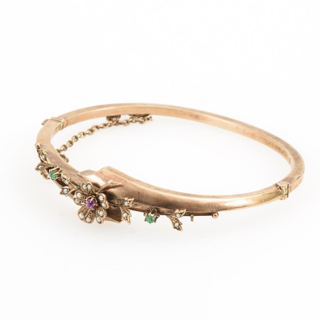 Armreif mit Rubin, Smaragden und Perlchen, um 1900.