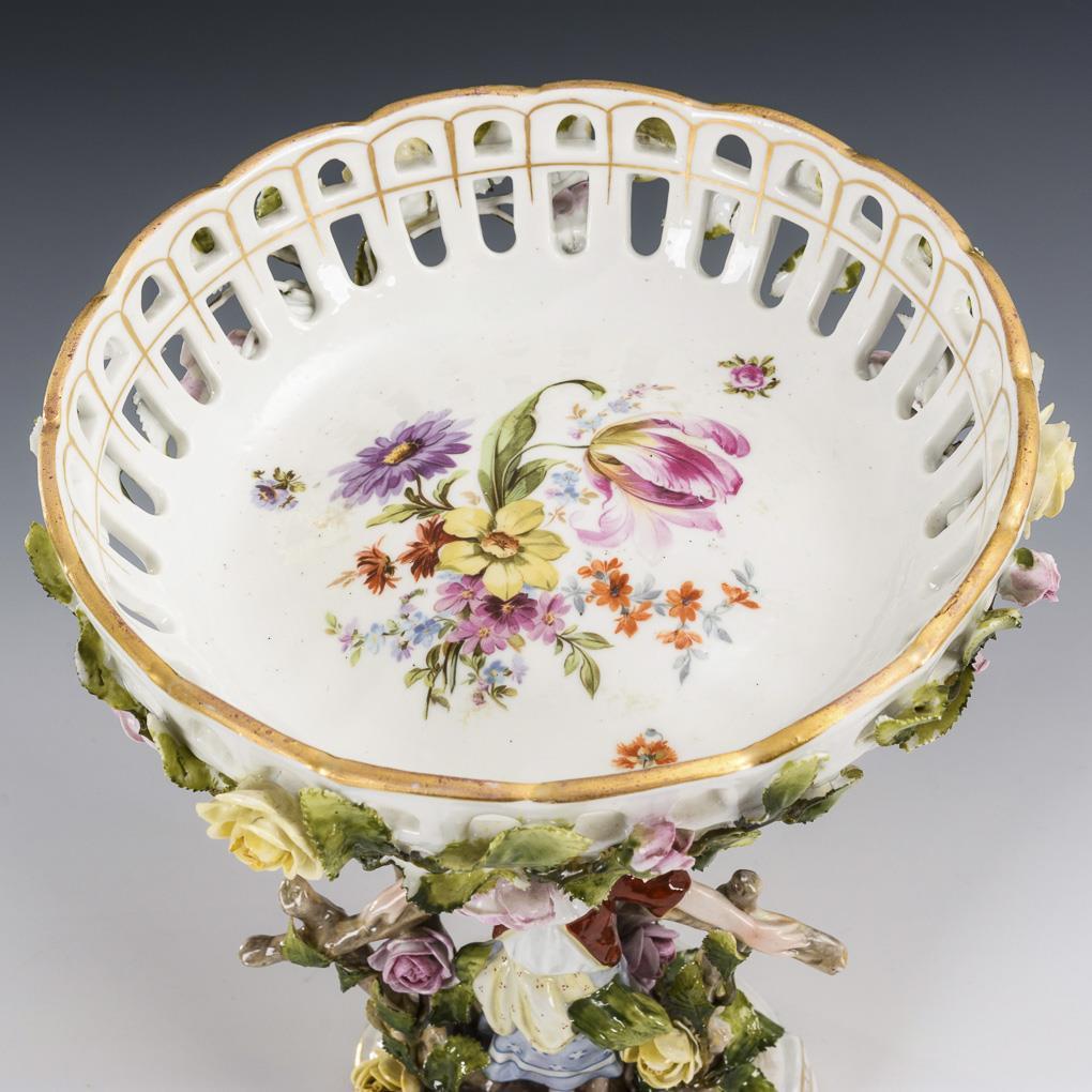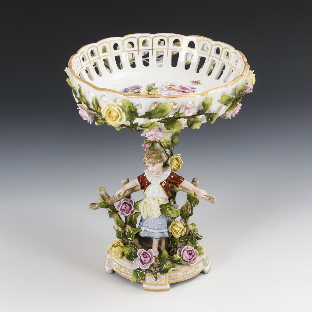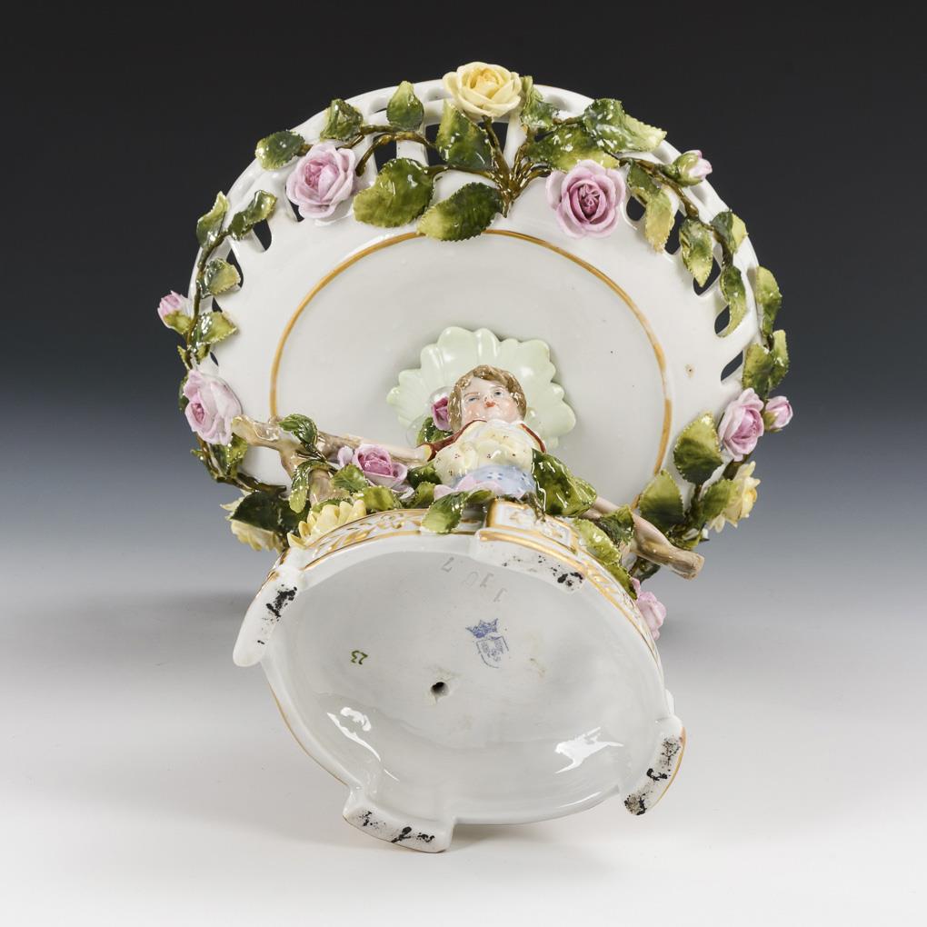 Tafelaufsatz mit blütenbelegter Durchbruchschale, auf Stammschaft mit Rosenranke und vor dem Schaft an einem Rosenspalier stehendes Mädchen (H 24,5 cm). / Zylinderdose mit reich frucht- und blütenbelegtem Deckel (Ø 12 cm). / Kugeldose mit blütenbelegtem Deckel (Ø 5,8 cm). Belag des Tafelaufsatzes und der Dosendeckel partiell bestoßen.