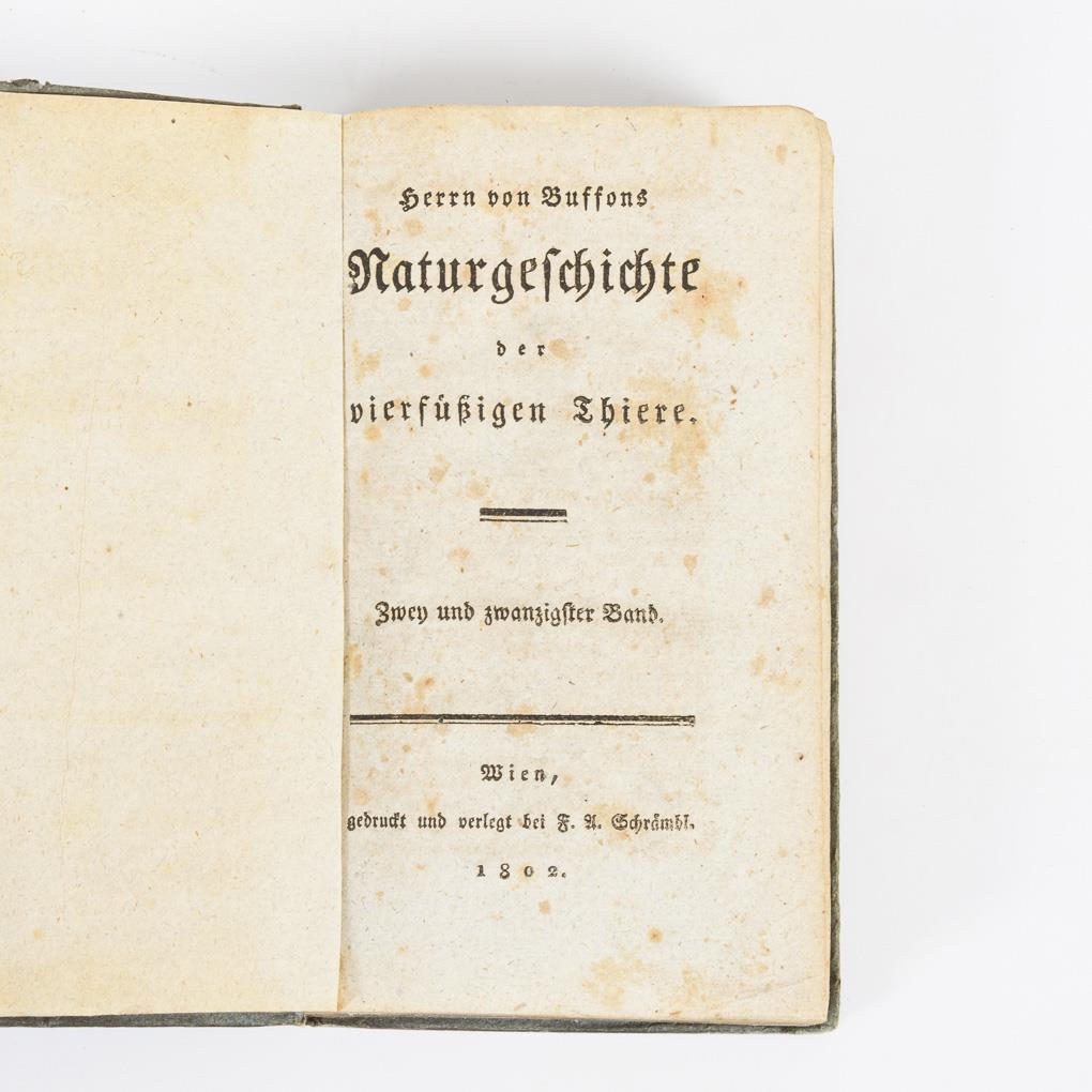 Ebert: "Naturlehre", 2. Band, gedruckt bei Joseph Georg Traßler, Troppau 1784. 494 Seiten und 10 farbig colorierte Kupferstich-Tafeln mit Vögeln und Fischen (2 fehlen vermutlich). Halbledereinband, Rotschnitt, 17,5 x 11 cm. / Buffon: "Naturgeschichte der vierfüßigen Thiere", 22. Band, gedruckt und verlegt bei F.A. Schrämbl, Wien 1802. (6), 320 Seiten und 20 meist farbig kolorierte Tafeln. Pappeinband, 17 x 10,5 cm.