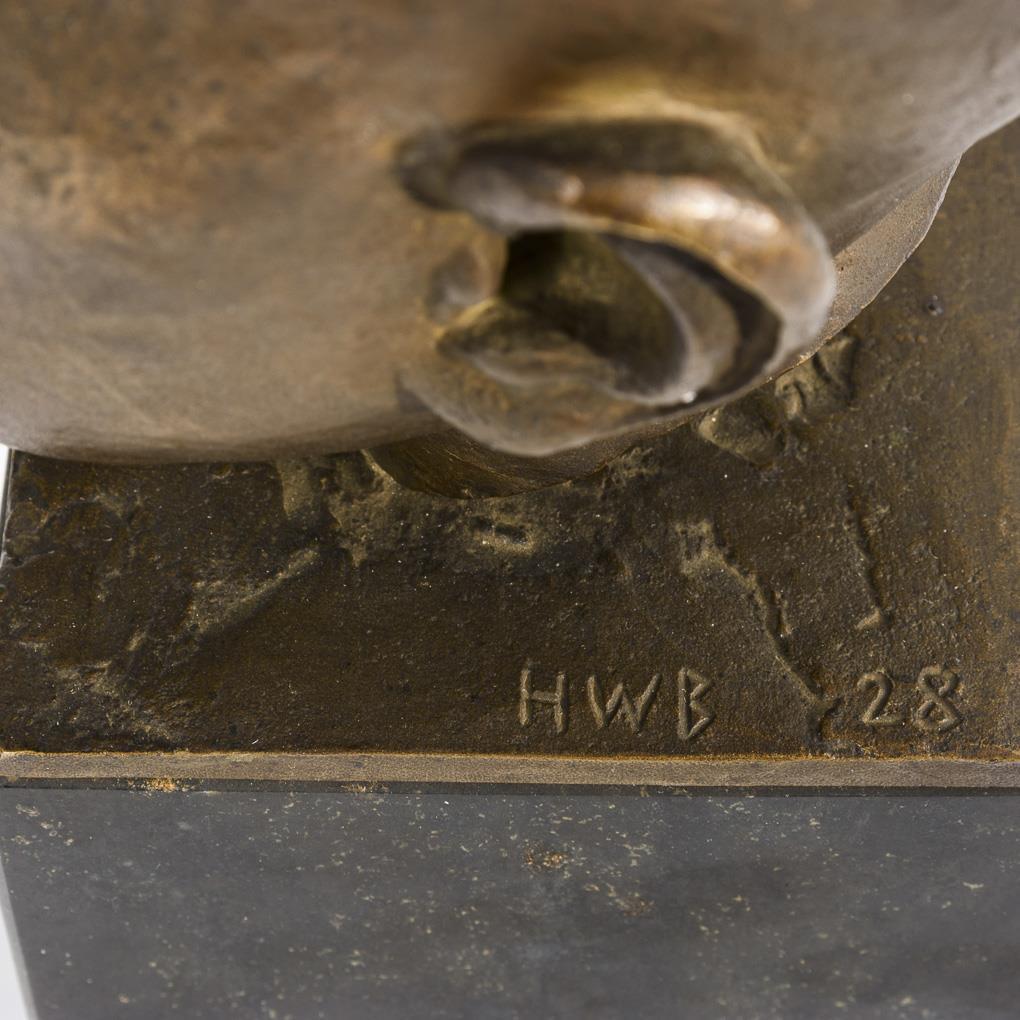 Bronze patiniert, Gießermarke "Brandstetter München", Serpentin-Sockel. Mit Monogramm HWB bezeichnet und datiert (19)28, in der Sockelfront betitelt. H 17 / 28 cm.