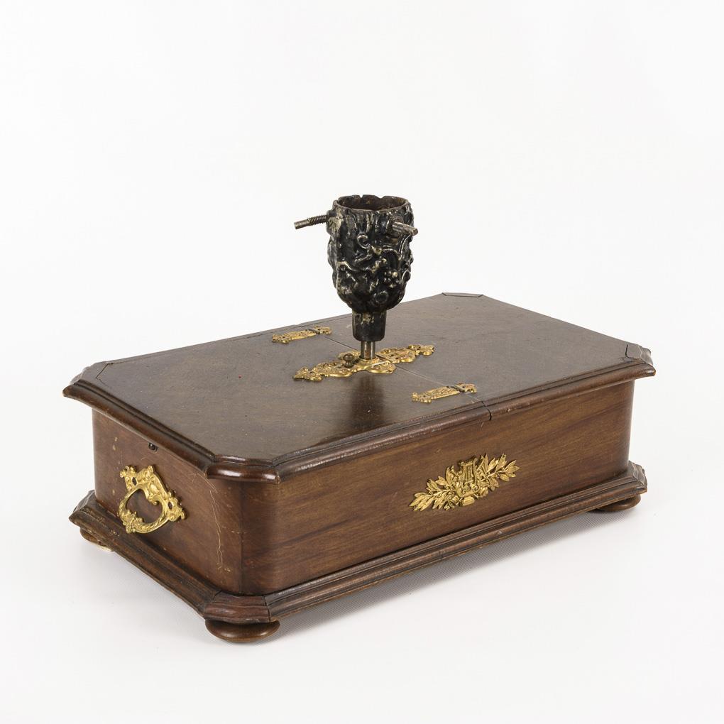 Nussbaum furniert, Messing-Beschläge, Gusseisen, Messing versilbert. Kasten 15 x 49 x 30 cm, H mit Baumhalter 30 cm.