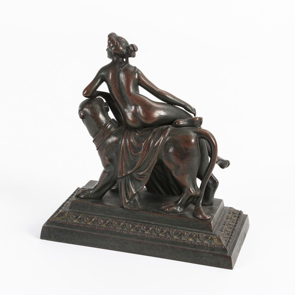 Bronzefarben patinierte Gruppe mit der nackten Frau auf der Wildkatze sowie gestufter Sockel mit Blattfries. Berieben.