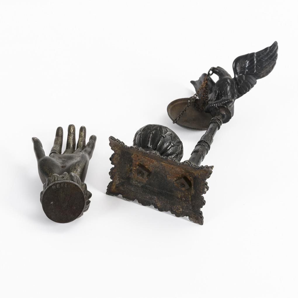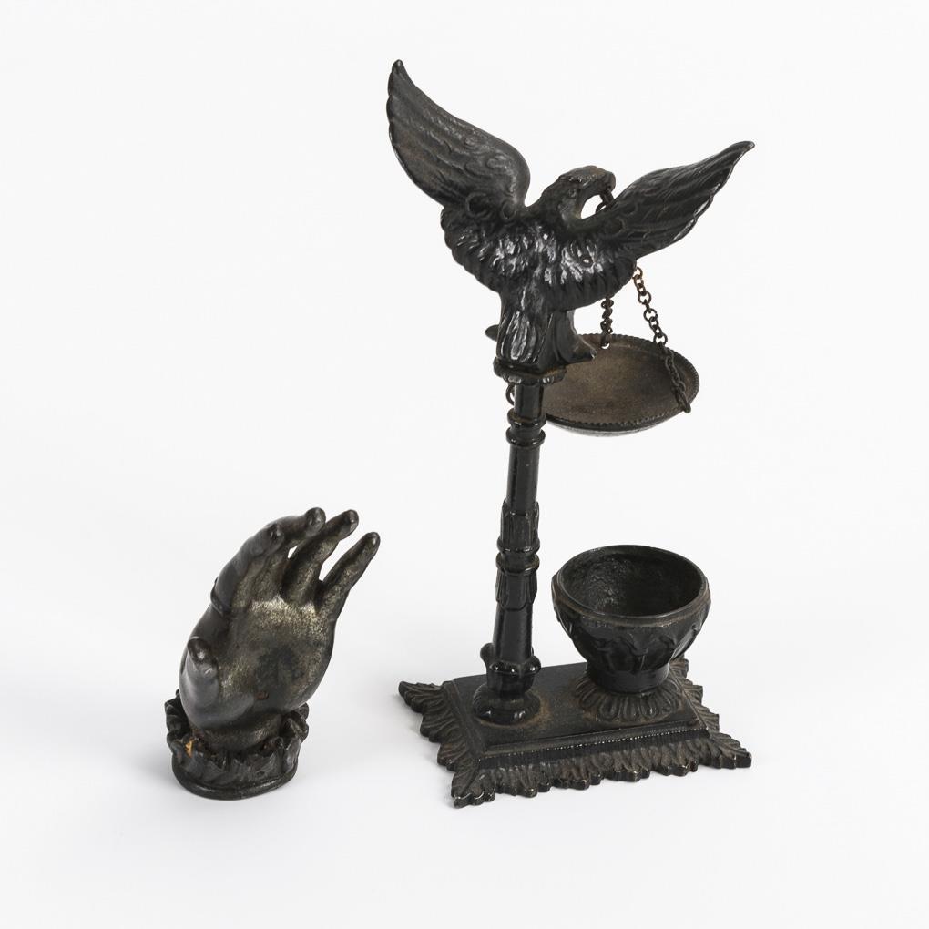2x Eisenguss: Räucherlampe mit Adler und Briefbeschwerer als Damenhand. Berliner Privatgießerei(?).