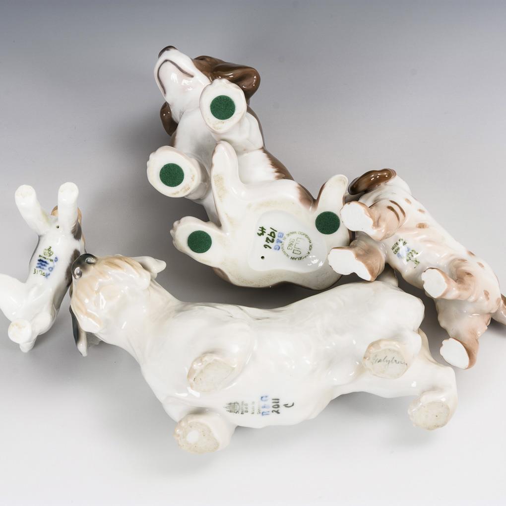 Unterglasurbemalung. 2 Terrier (H 8 und 10 cm) und 2 Hundewelpen (H 12 und 16 cm).