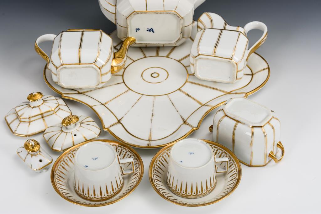 9 Teile. Rechteckige Form mit angeschnittenen Ecken. Kanne (H 18,5 cm), Milchkännchen (H 14 cm), Wasserkännchen (H 12,5 cm), Zuckerdose (H 11,5 cm) und quadratisches Tablett (30 x 30 cm). Dazu 2 konische Tassen (H 5,5 cm) mit Untertassen (Ø 12,5 cm). Partieller Goldabrieb.