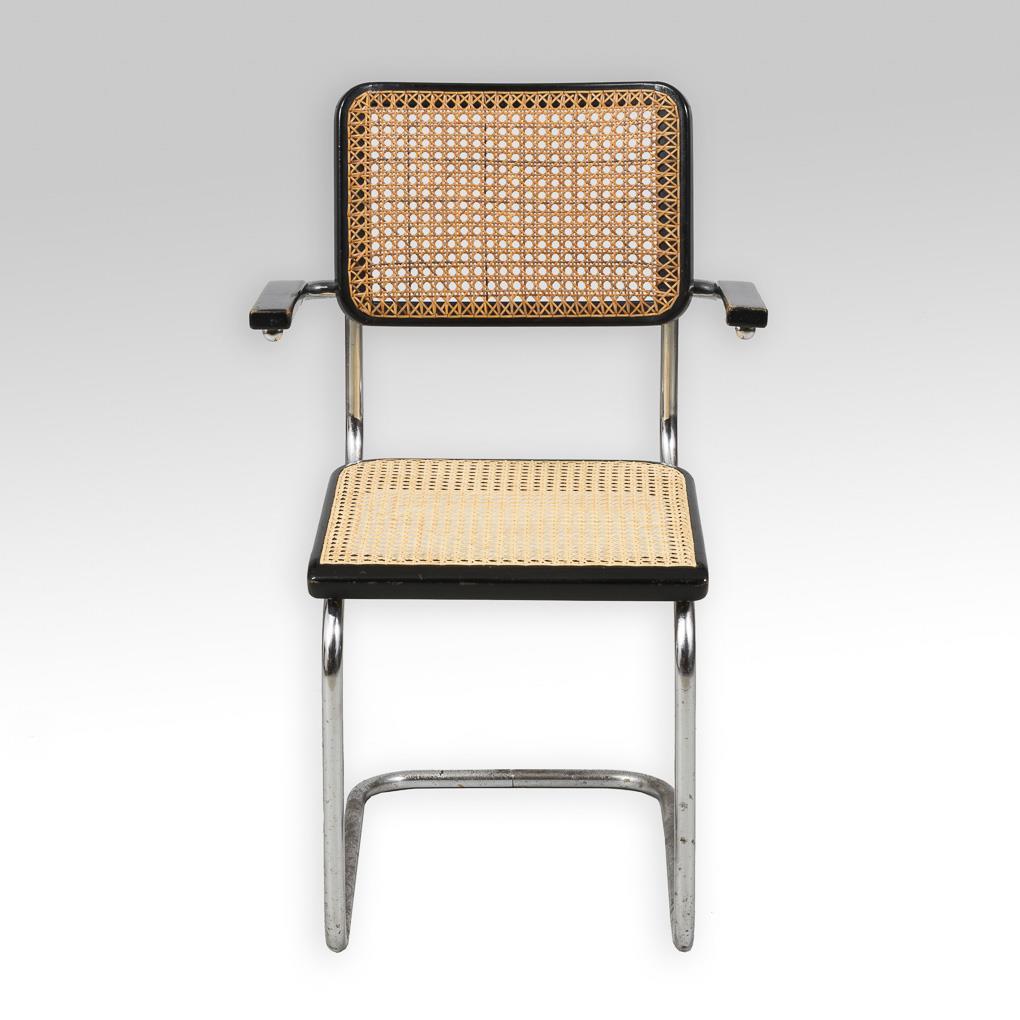 Freischwinger mit Sitzfläche und Rückenlehne aus Korbgeflecht "S 23 R" nach den Entwürfen von Mart Stam oder Gerhard Stüttgen. Alters-/Gebrauchsspuren, etwas rostig, Korbgeflecht ergänzt.