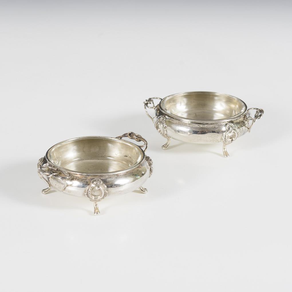 Kleine runde Schälchen auf je 4 Rocaillenfüßen. Kleine Dellen.
