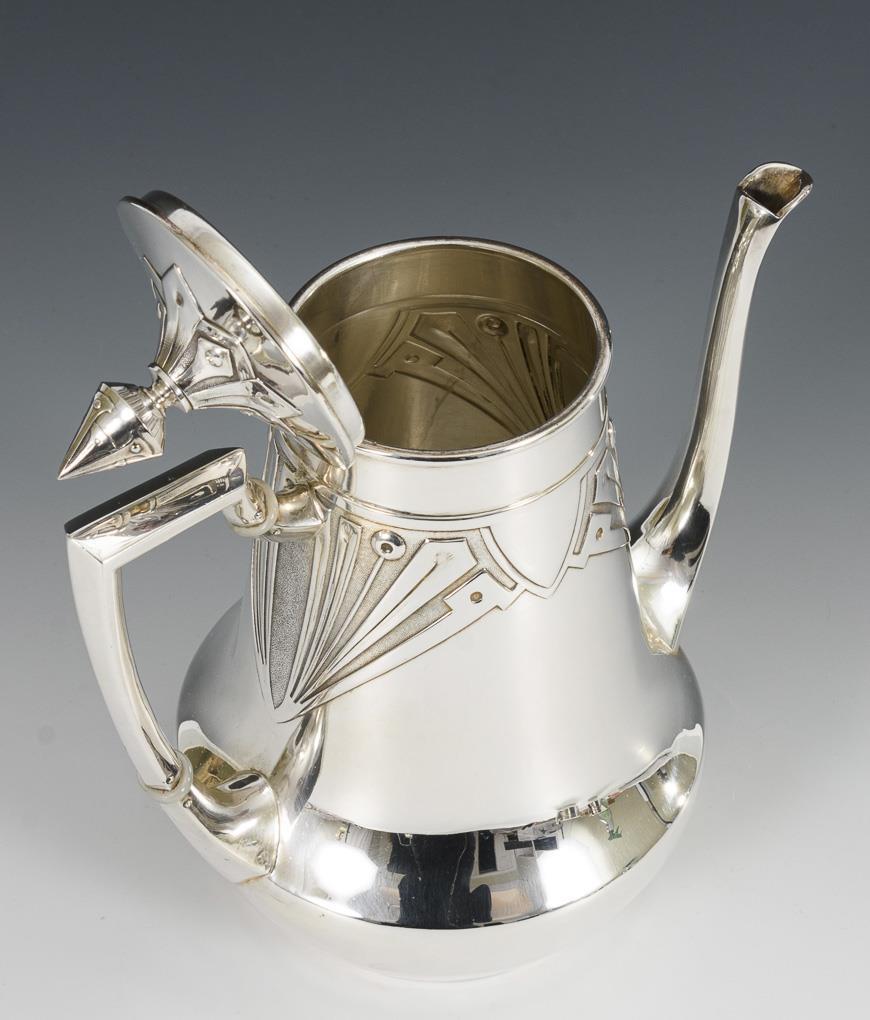 Elegante Form mit geometrischem Reliefdekor: Kaffeekanne, Zuckerschale, Milchkännchen.