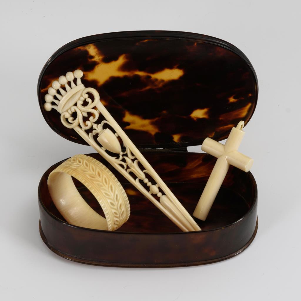 Schildpatt-Dose und 3 Kleinteile Elfenbein