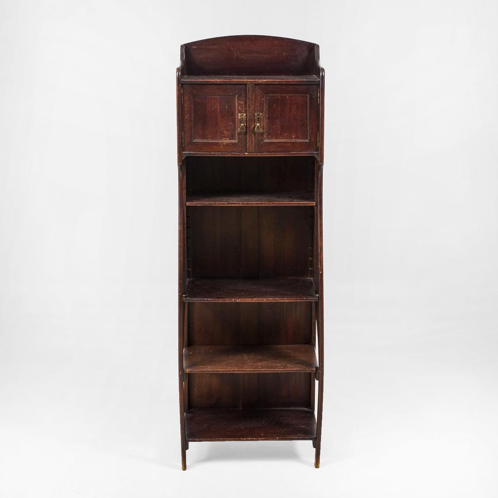 Zierliches Regal mit 4 Fächern (davon 1 höhenverstellbar), 1 geschlossenem Fach mit 2 Türen und oberer, 3-seitig umfasster Ablage; stilförmig geschwungene Seitenbretter im unteren Bereich offen gearbeitet. Alters-/Gebrauchsspuren.