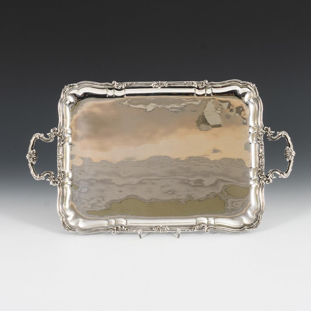 Rechteckige Form mit reliefierter Kante und geschweiften Handhaben. 1 Handhabe mit kleinen unterseitigen Rissen.