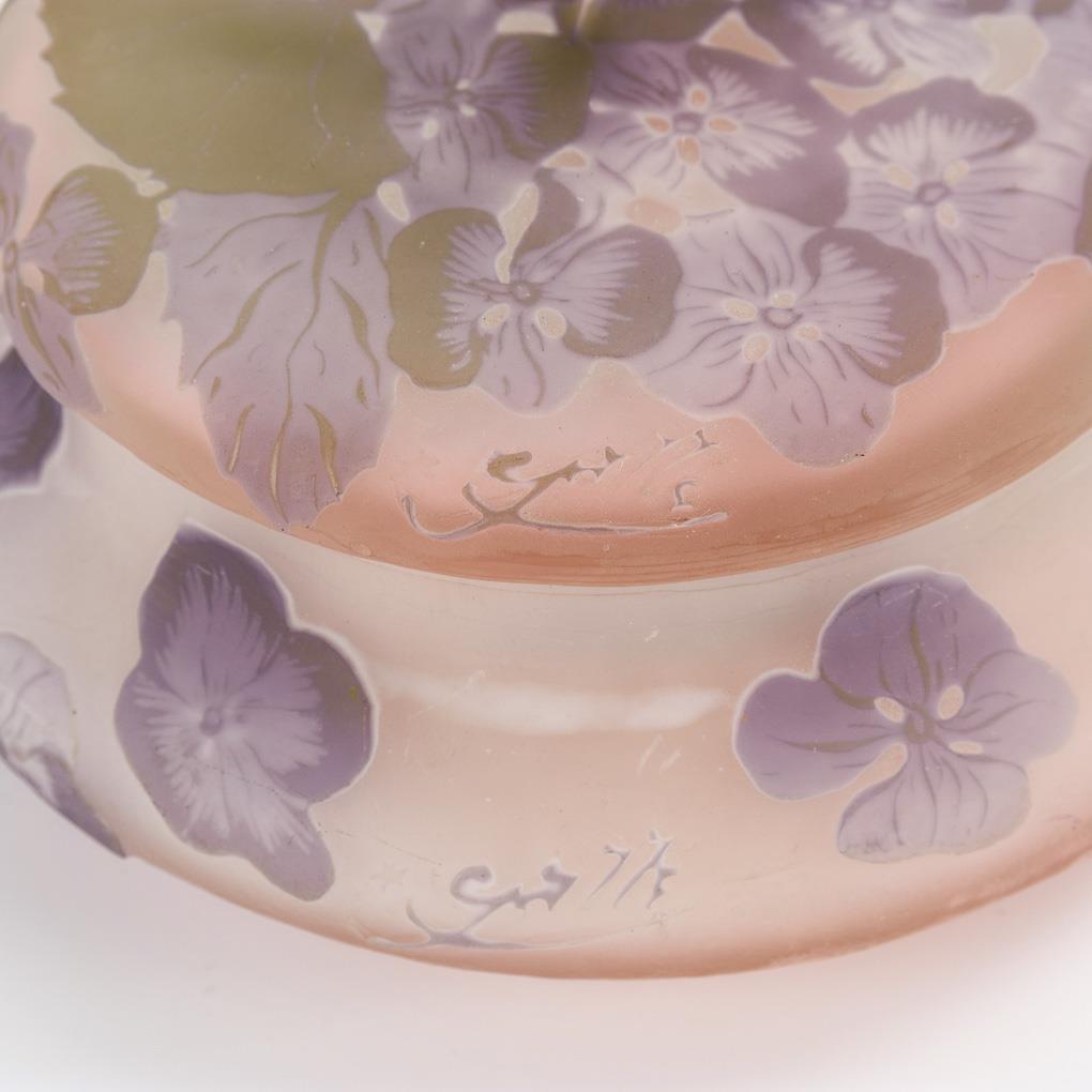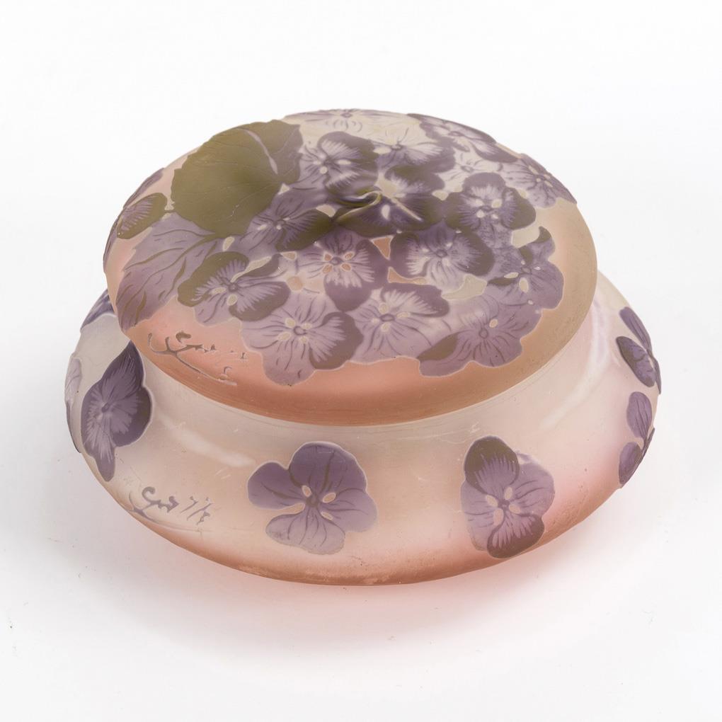 Gedrückt gebauchte Dose. Umlaufend und auf dem Deckel geätzte Hortensienblüten.