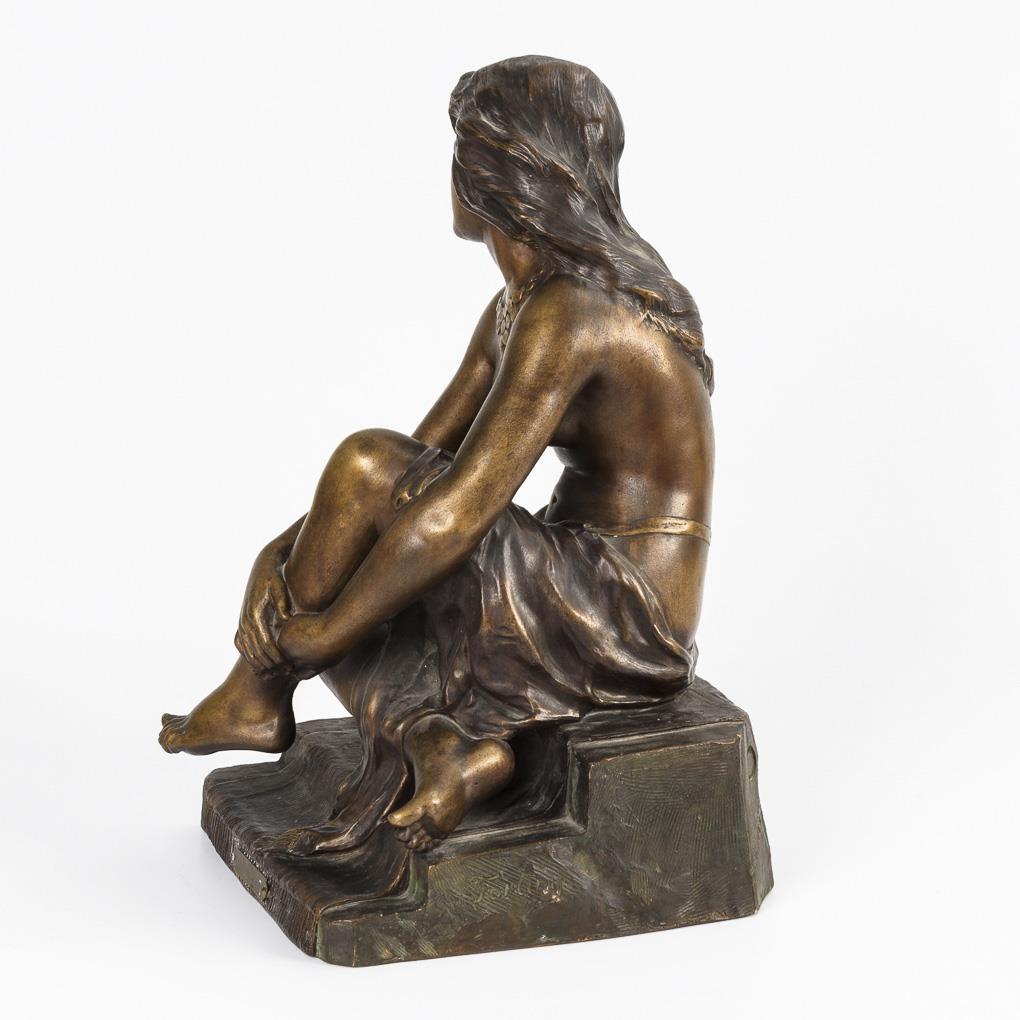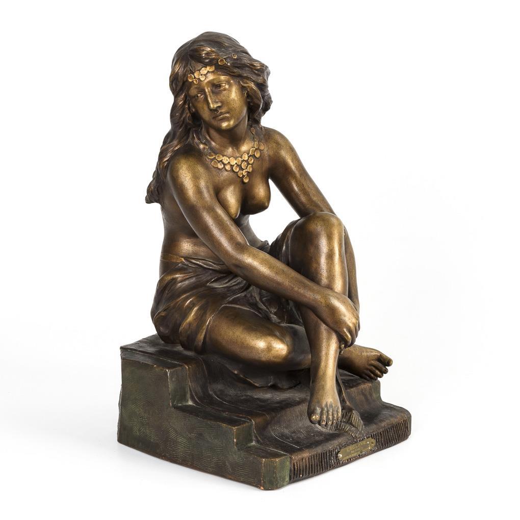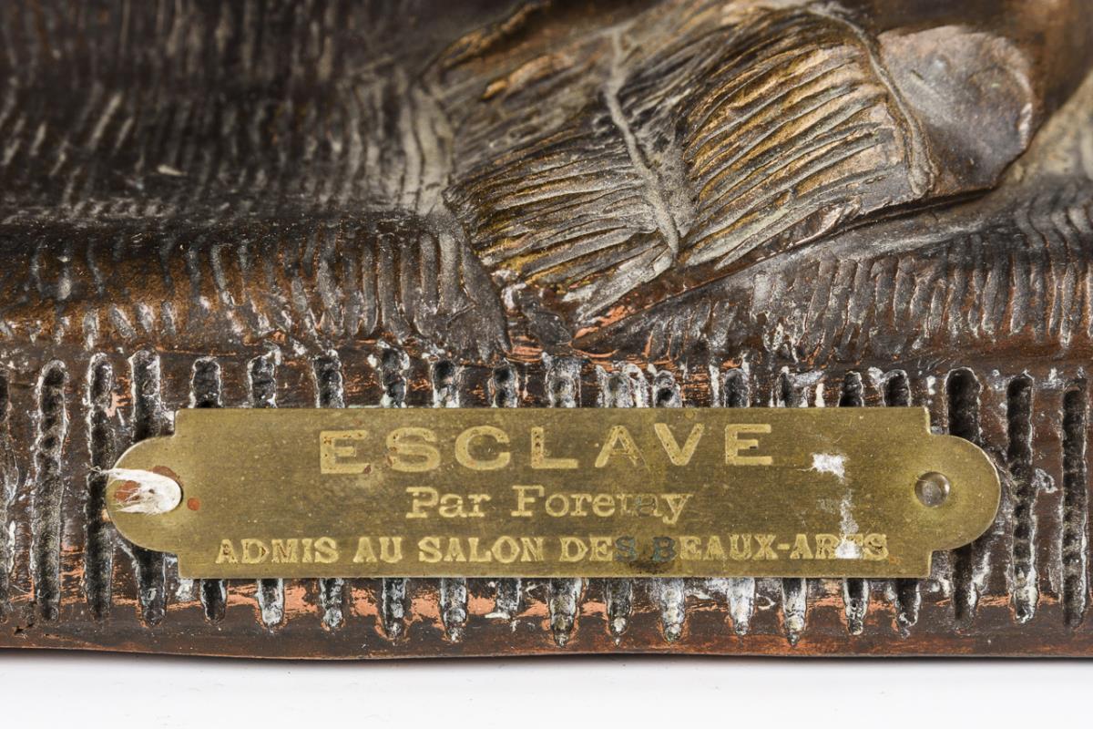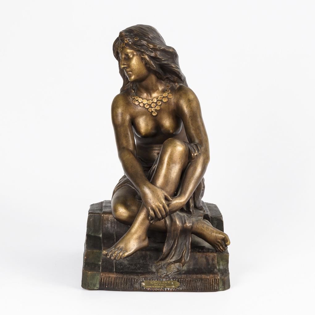 Terrakotta bronzefarben gefasst. Undeutlich bezeichnet, undeutliche Werkstattmarke "Fontaine & Durieux Paris", "Terre Cuite G Feu" und "Fabrication Francaise". In der Sockelfront Messingplakette mit Titel "Esclave" und Bezeichnung. H 45 cm.
