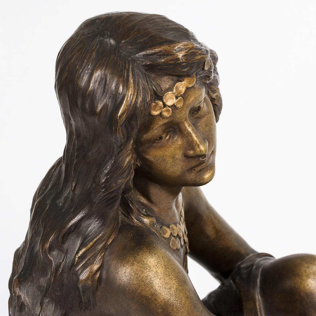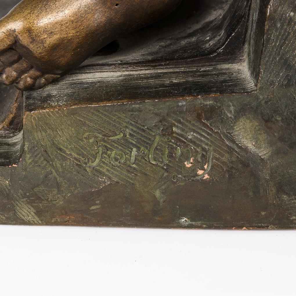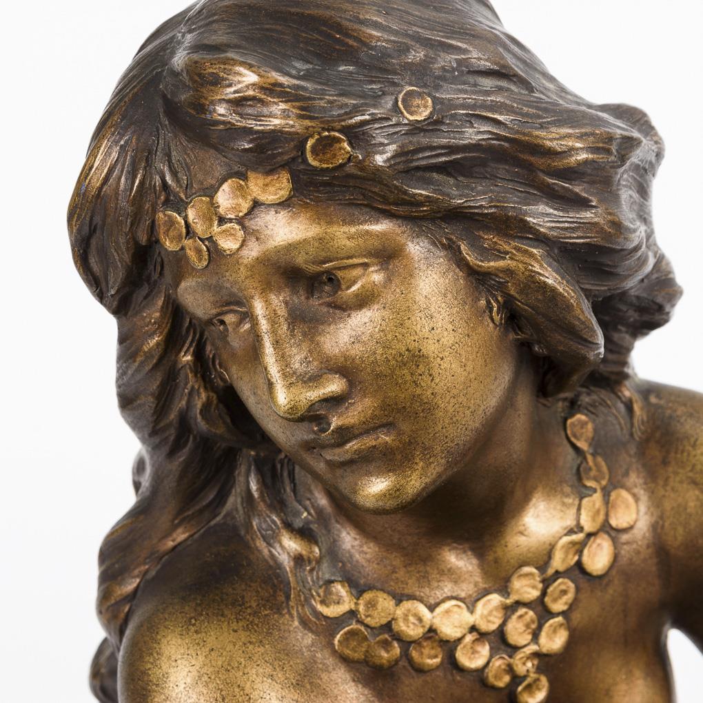 Terrakotta bronzefarben gefasst. Undeutlich bezeichnet, undeutliche Werkstattmarke "Fontaine & Durieux Paris", "Terre Cuite G Feu" und "Fabrication Francaise". In der Sockelfront Messingplakette mit Titel "Esclave" und Bezeichnung. H 45 cm.