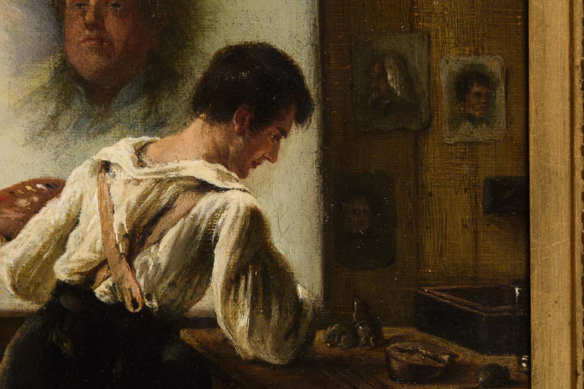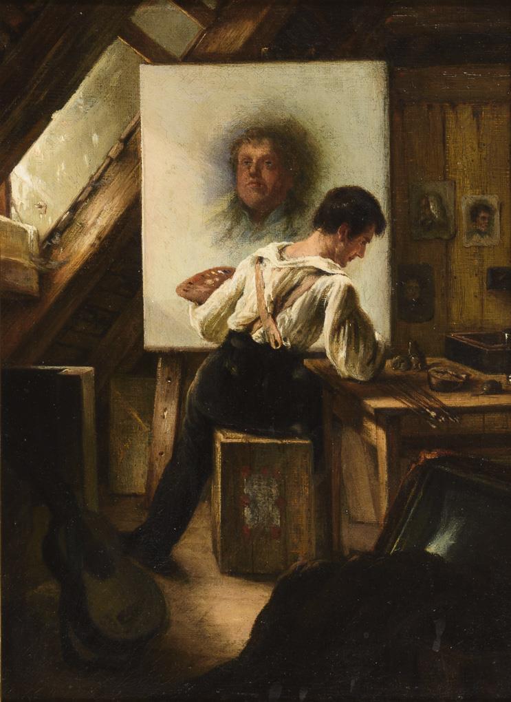 Der junge Mann beim Malen eines Bildnisses im Dachgeschoss. Altersspuren.
