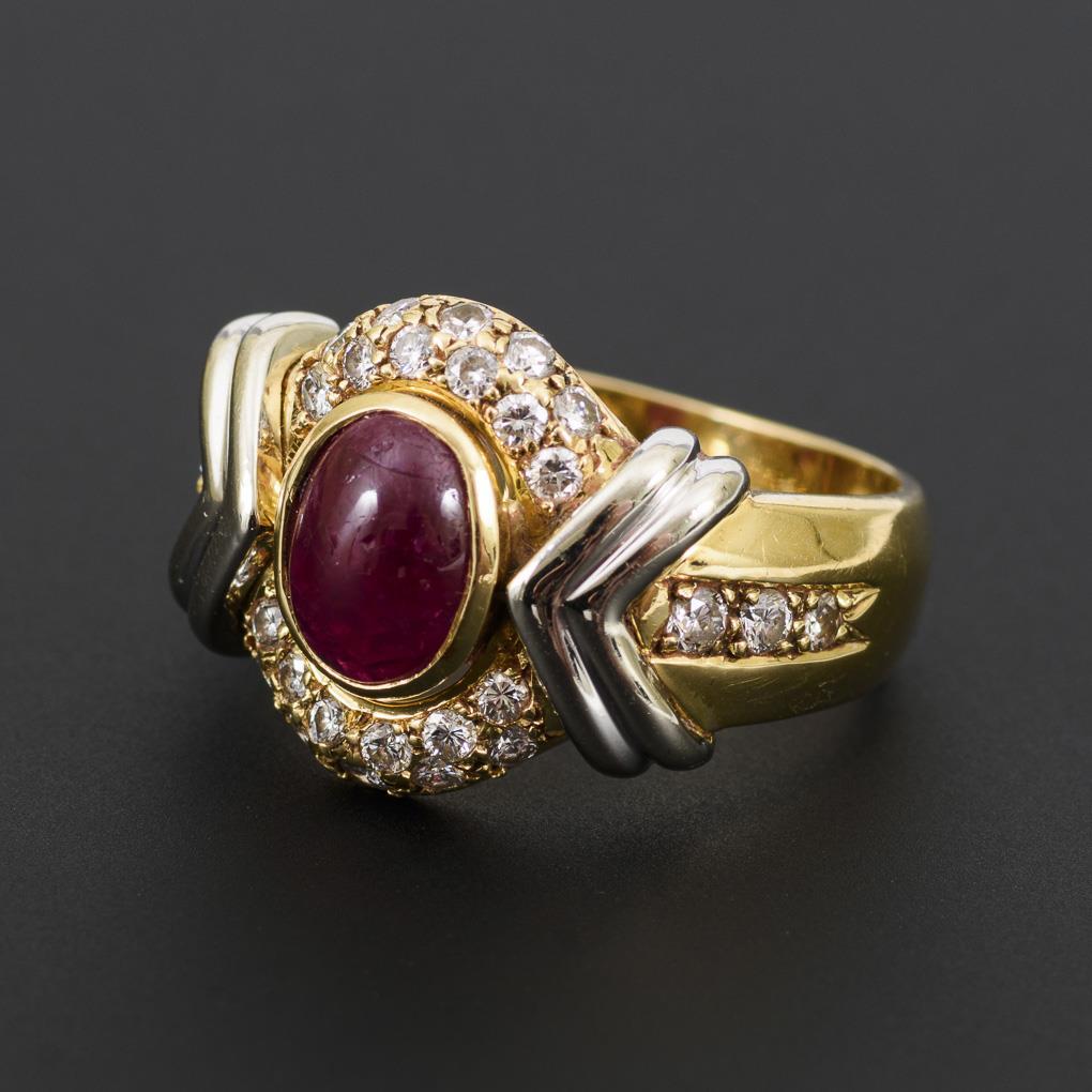 Zargengefasster Cabochon, umgeben von 28 eingelassenen Brillanten, zwischen breiter Schiene. Cabochon mit 3 kleinen Chips.
