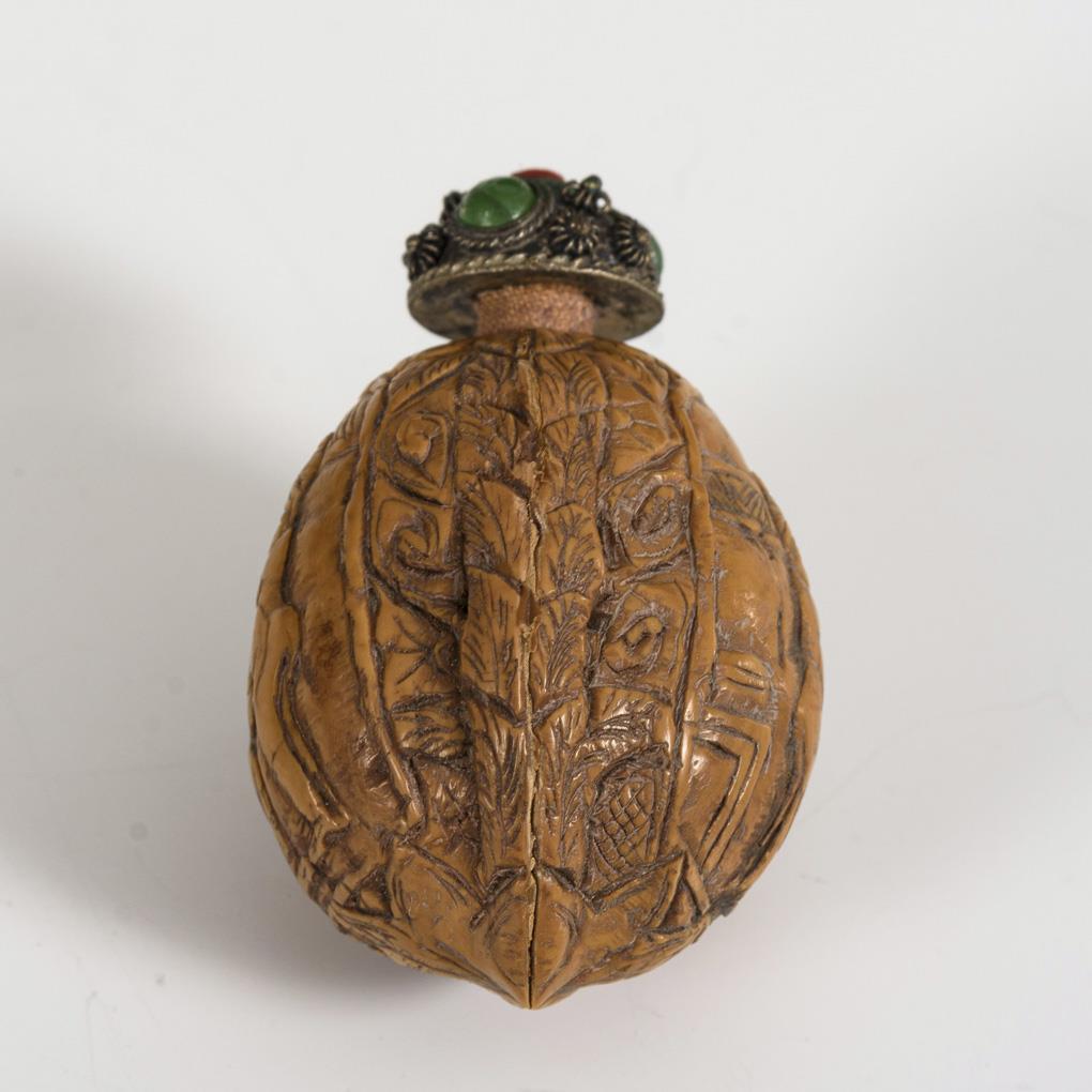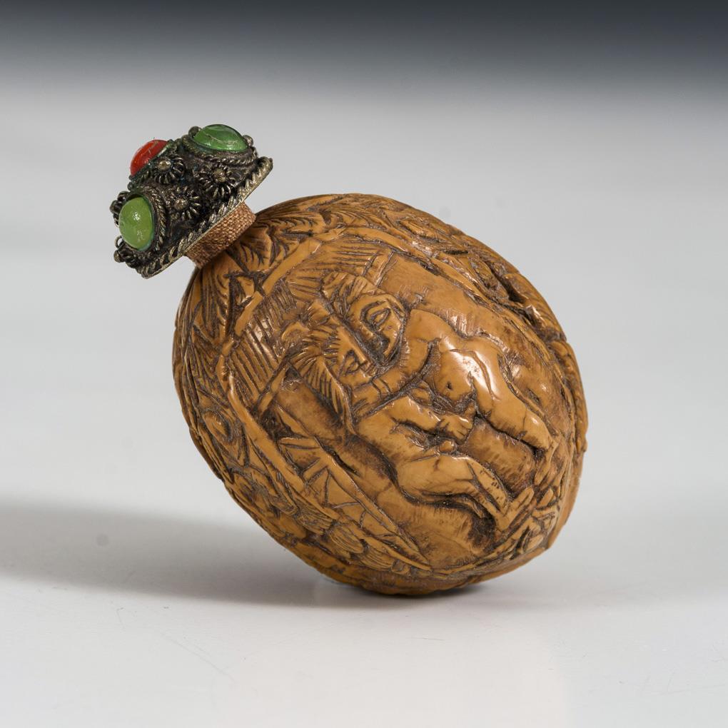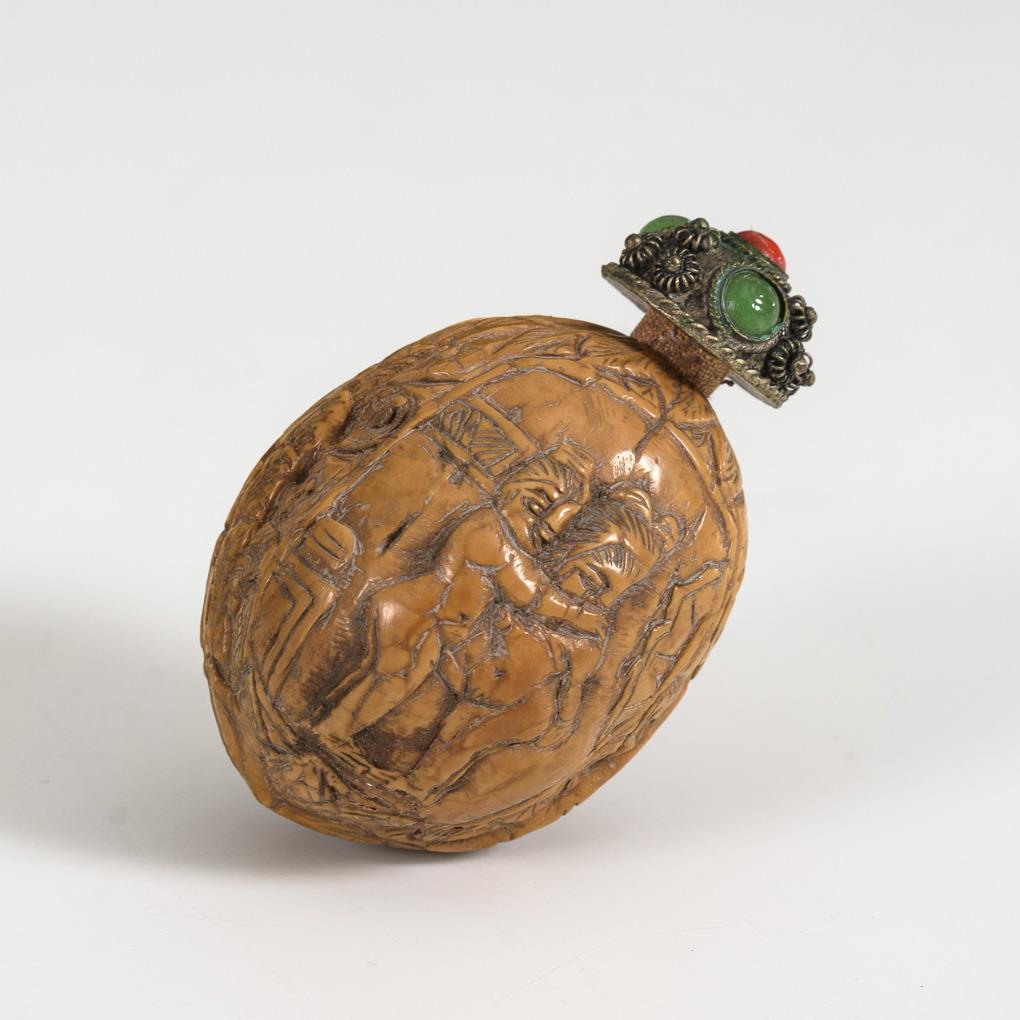Walnuss als Snuffbottle mit erotischer Darstellung.