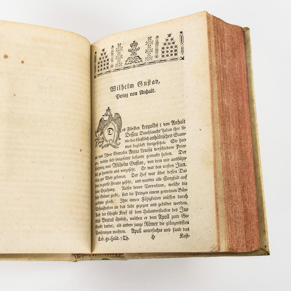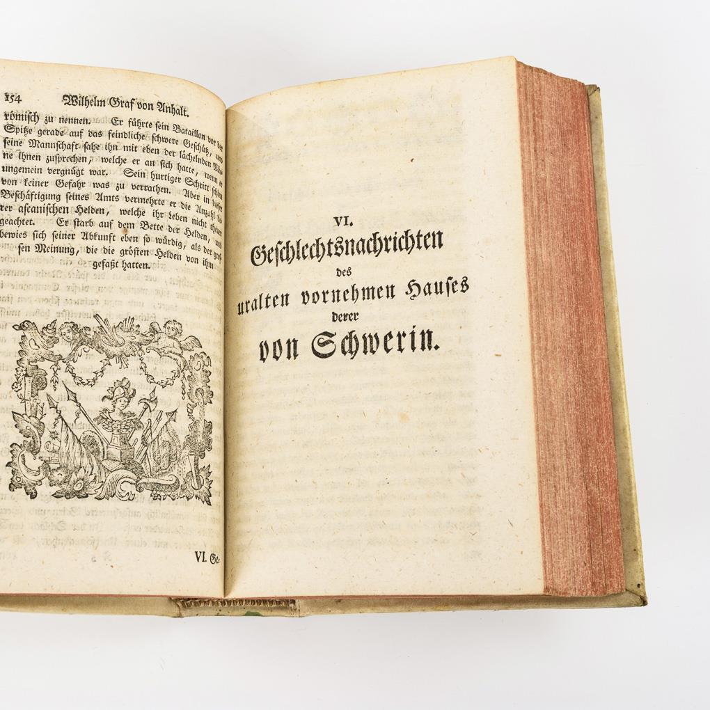 Titelblatt, (24), 272, (4), (12), 332, (6) Seiten. Pergamenteinband, Rotschnitt. Inhalt: Adrian Bernhard Graf von Borcke / Carl Christoph Freiherr von der Goltz / Christian Ludwig von Pfuel / Wilhelm Gustav Prinz von Anhalt / Wilhelm Graf von Anhalt / Geschlechtsnachrichten des uralten vornehmen Hauses derer von Schwerin / Albrecht Heinrich Prinz von Braunschweig / Einige Nachrichten von dem jetzigen Moselschen Regiment / Georg Christoph von Kreutzen / Bernd Siegmund von Blankensee / Geschlechtsnachrichten aus dem hochadelichen Hause derer von Blankensee / Constantin Guido von Podewils / Dubislaw Gneomar von Ratzmer Hans Adam von Schöning / Albrecht Conrad Reichsgrafen v. Finkenstein / Alexander Hermann Reichsgrafen von Wartensleben / Zusatz, von der Goltz.