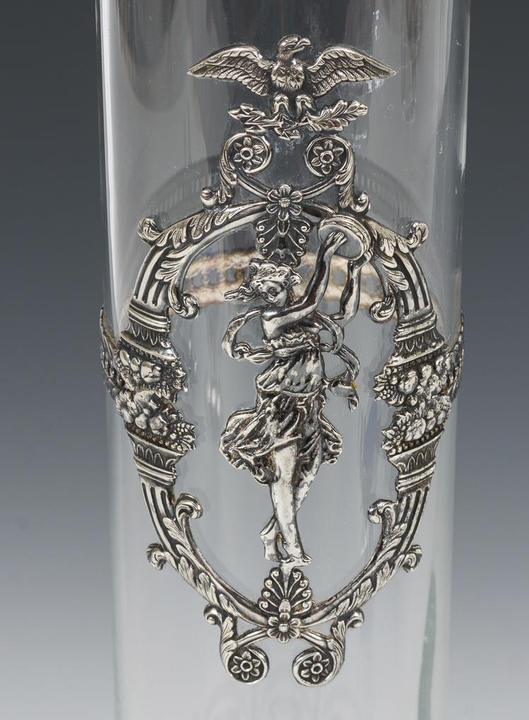 Schlanke Stangenvasen mit reliefierten Verzierungen im Stil des Klassizismus. 1x Montierung lose, mit Kleberesten am Glas.