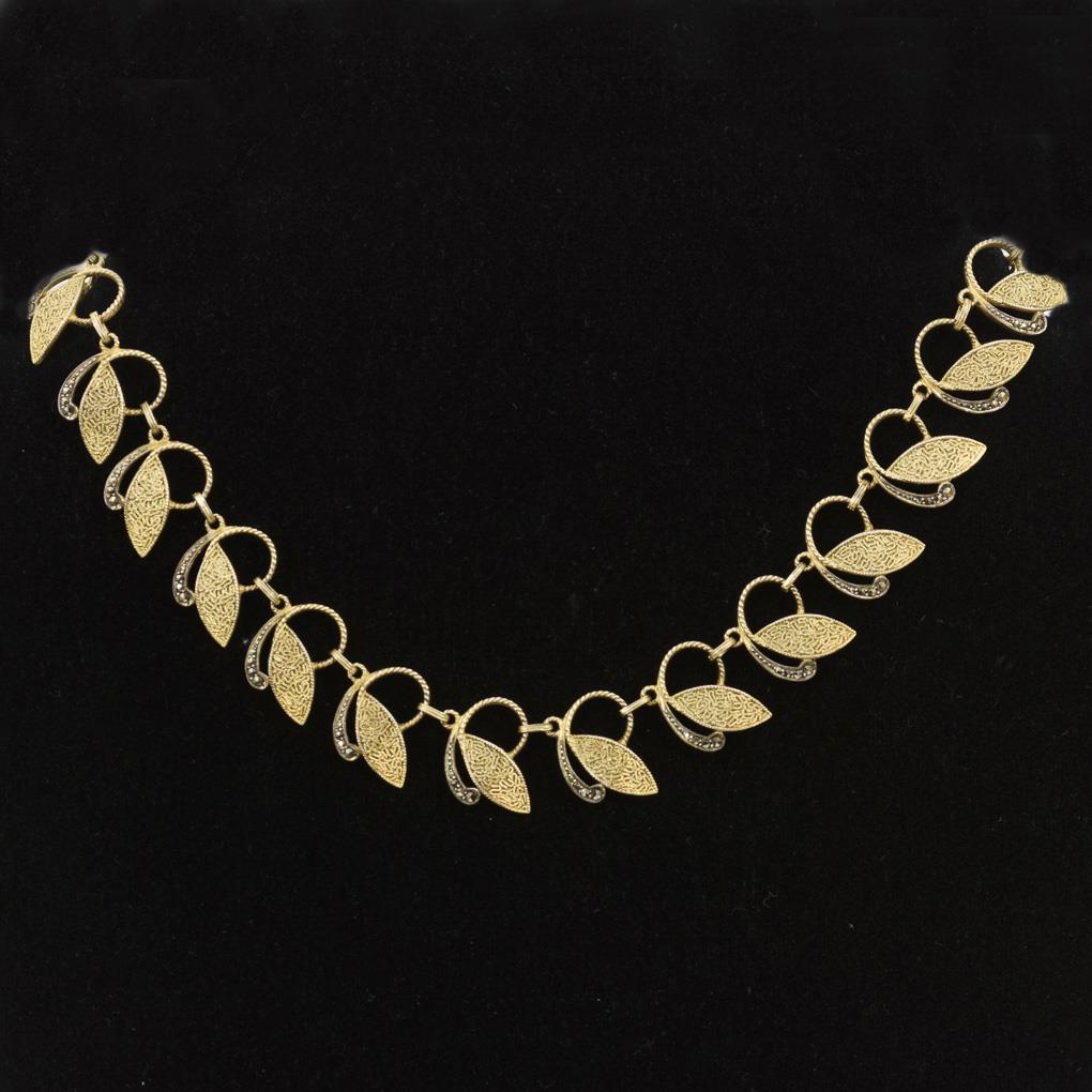 Stilisierte, filigrandrahtverzierte Blattglieder mit kleinen Markasiten. Ringfederschließe.