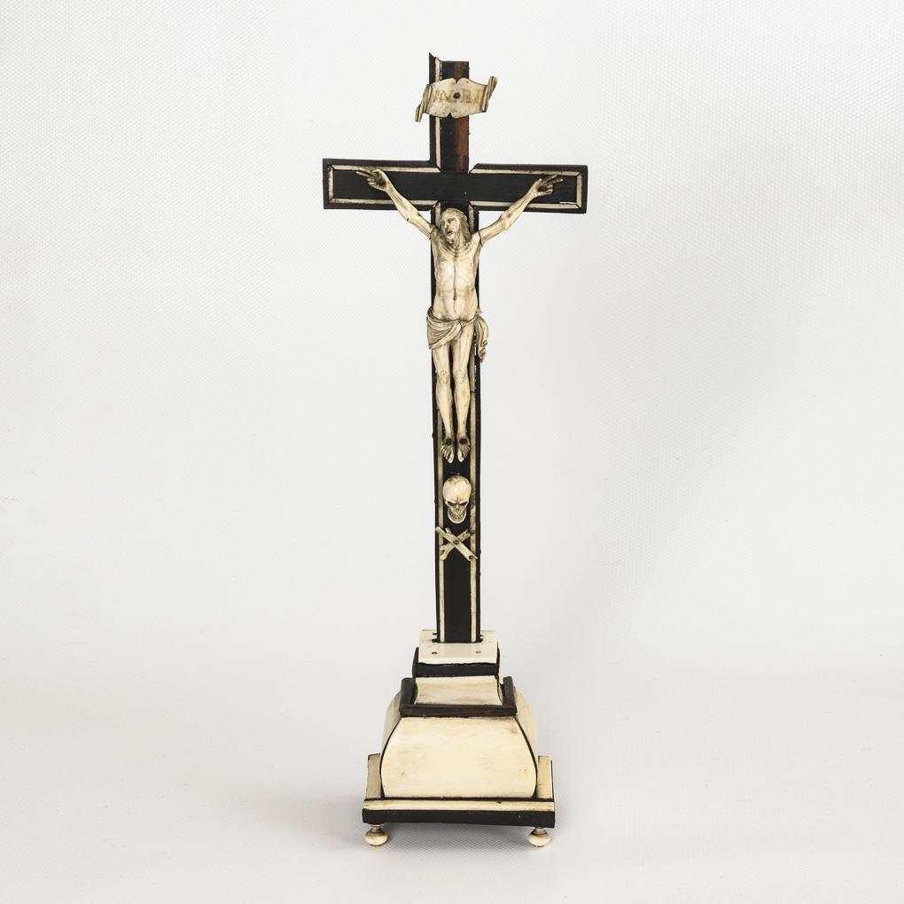 Elfenbein geschnitzt bzw. inkrustiert, Ebenholz(?). 18. Jh. Gesamt 41 x 10 x 7 cm.