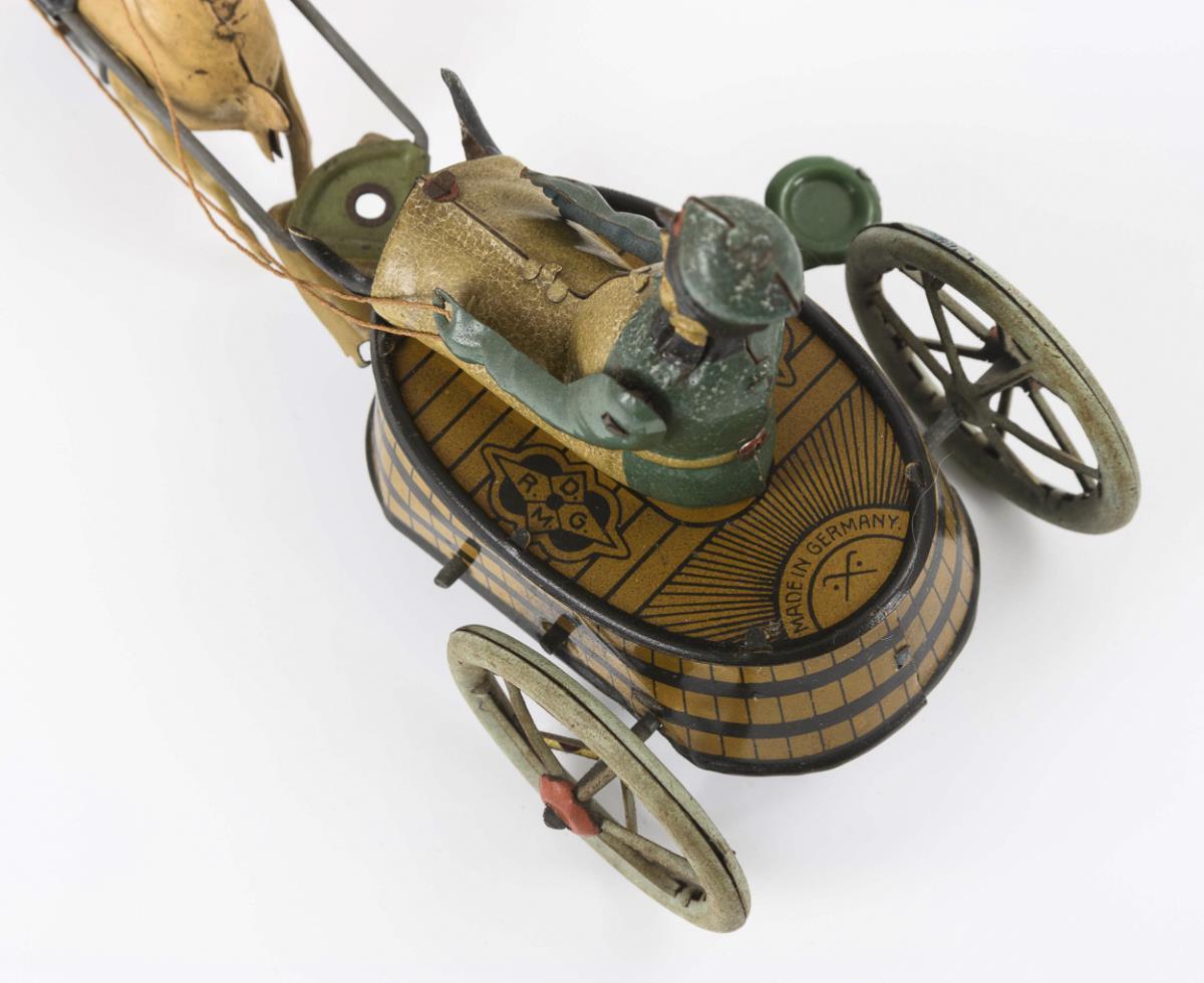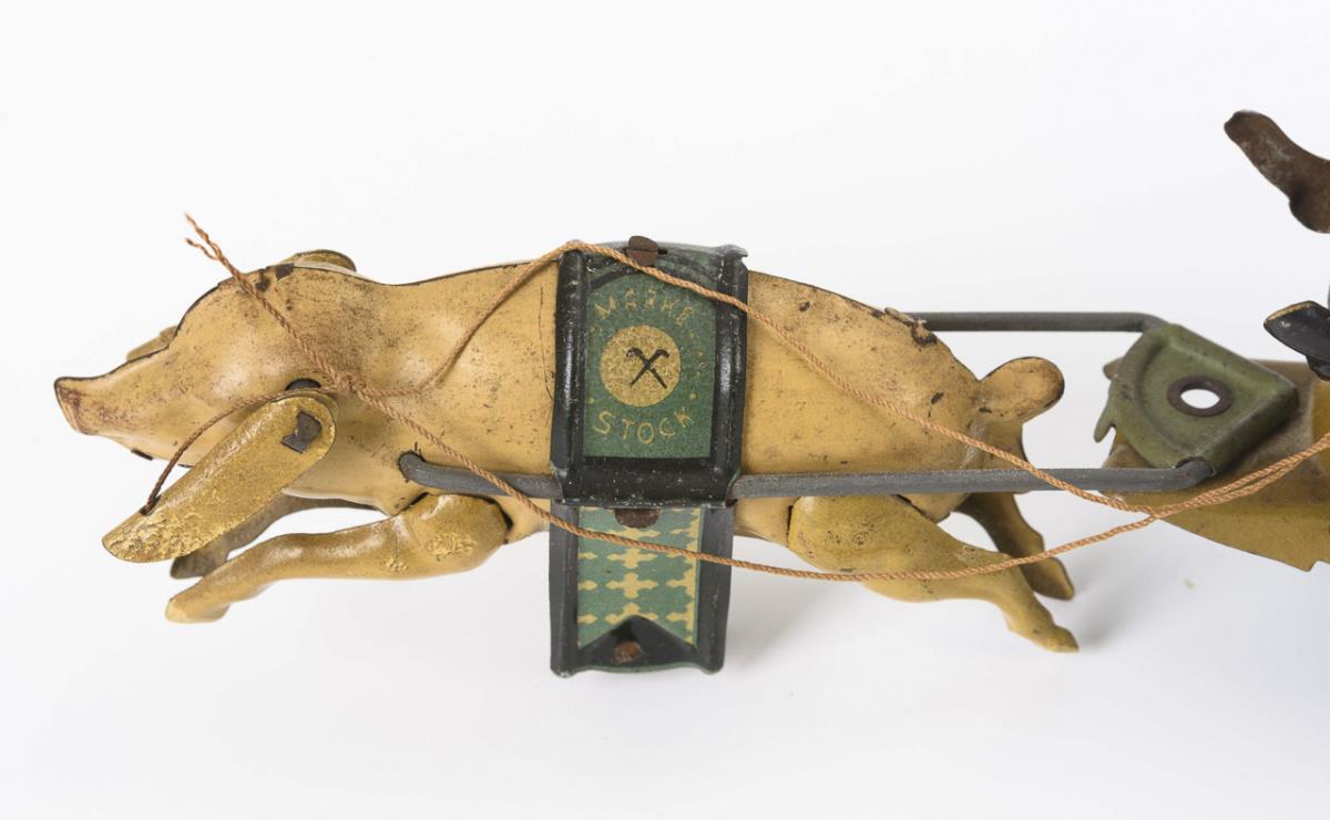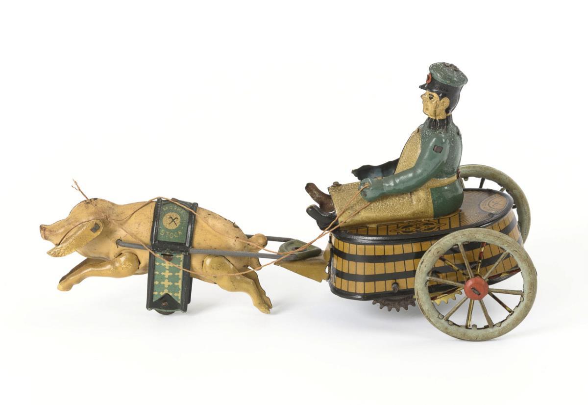 Kleines Gespann mit einem Schwein als Zugtier, einem Bottich als Wagen und einem Metzger als Kutscher. Uhrwerk intakt. Altersspuren.