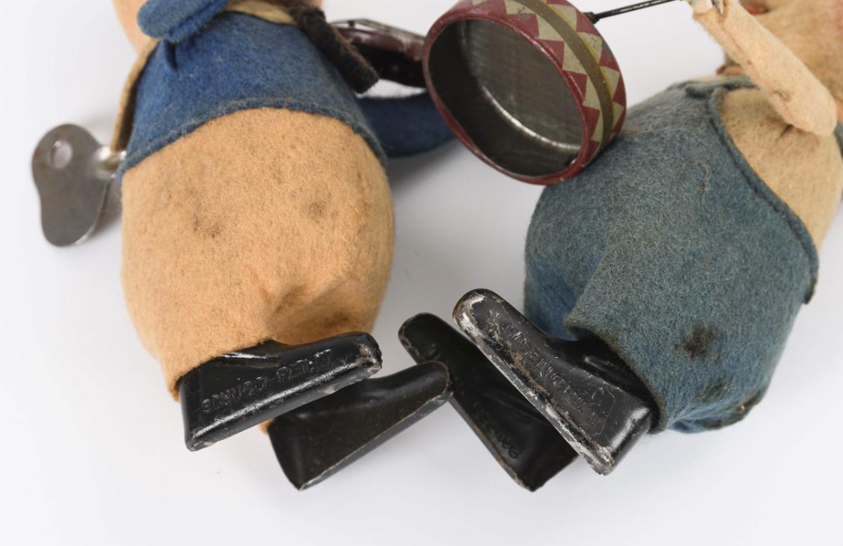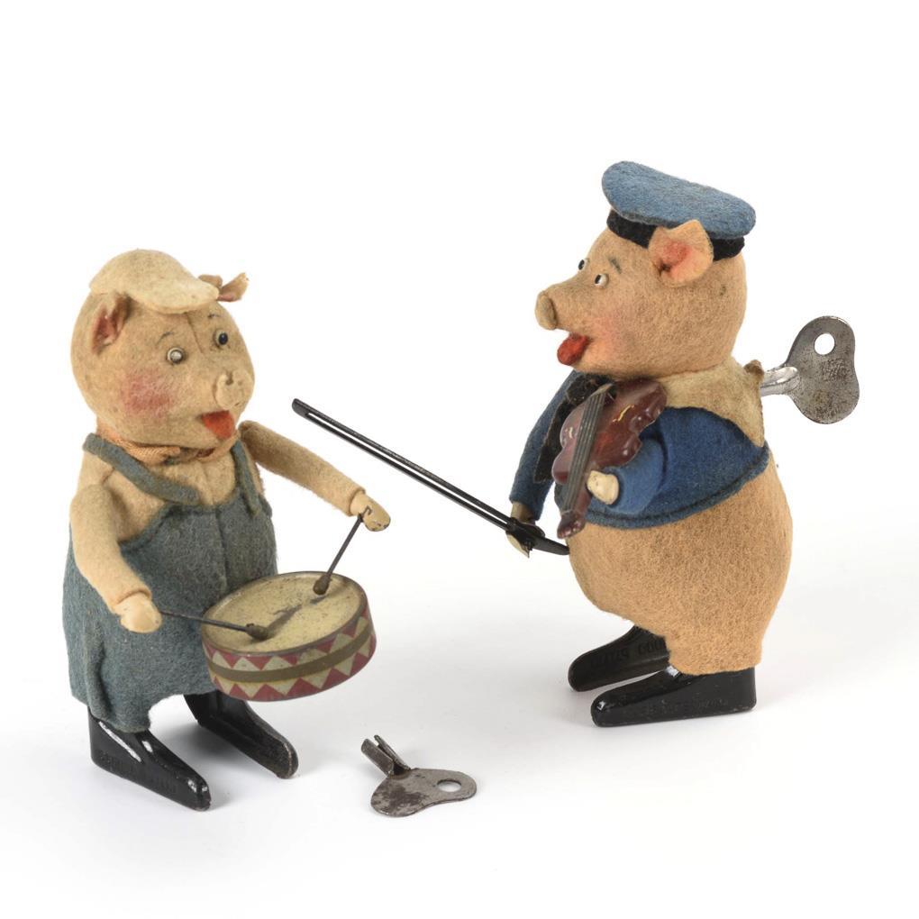 Lizenzfiguren nach "Three Little Pigs". Mechanisches Schwein als Trommler und mechanisches Schwein als Violinist. Werke intakt. Altersspuren, Ohren des Trommlers mit Mottenfraß.