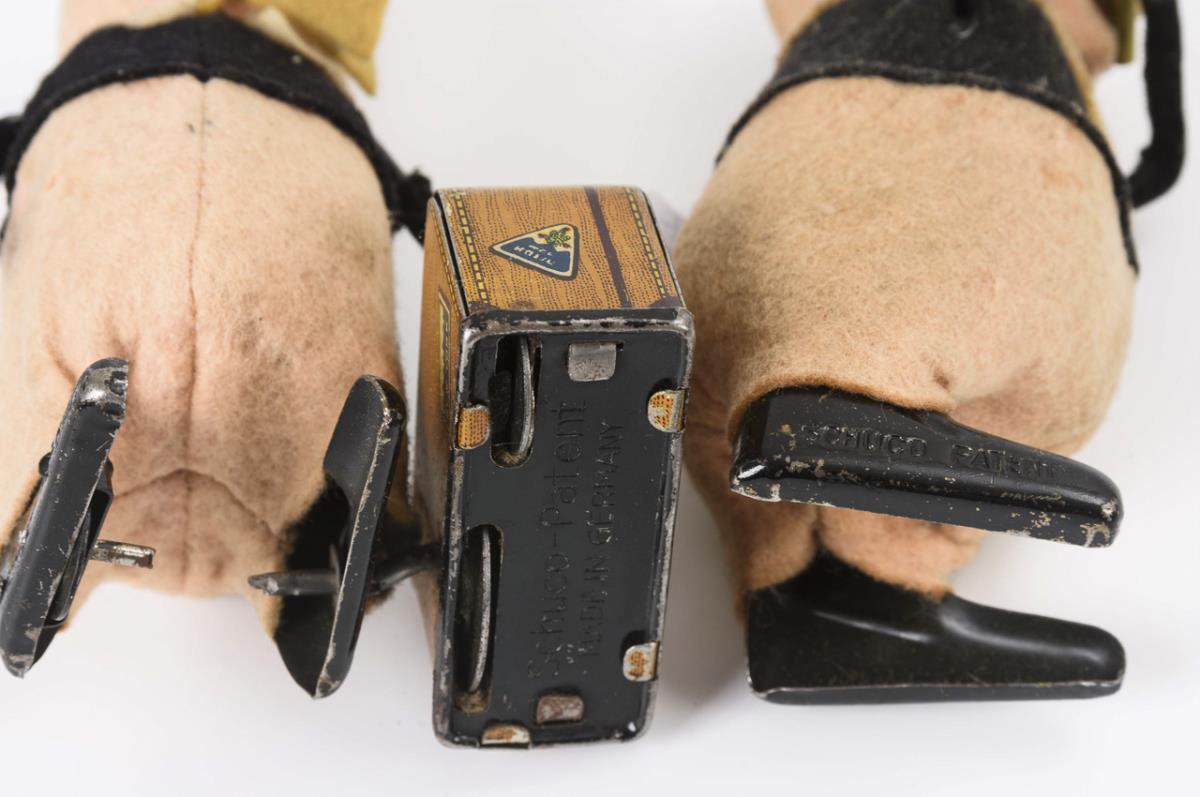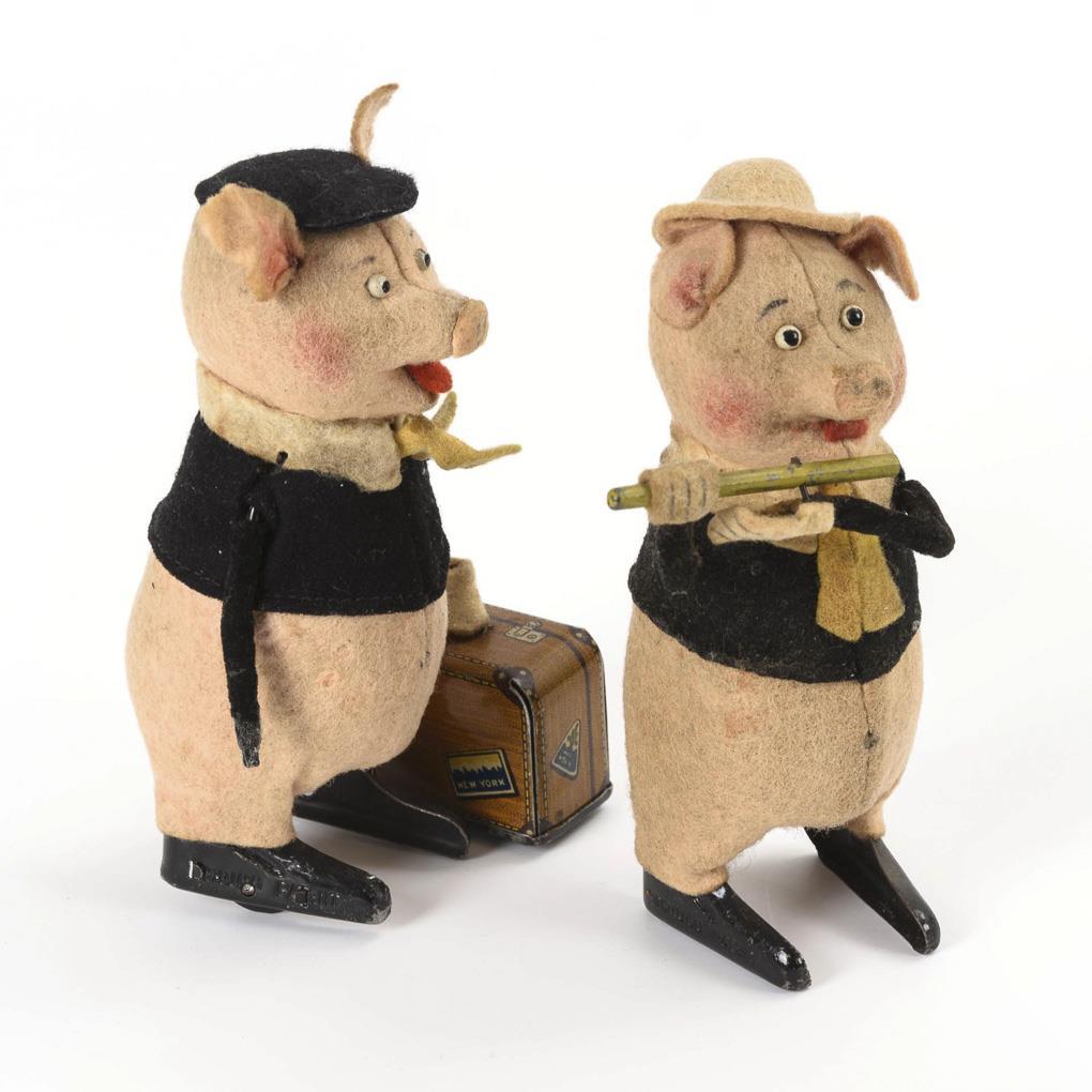 Lizenzfiguren nach "Three Little Pigs". Mechanisches Schwein mit Koffer und mechanisches Schwein mit Querflöte. Werke intakt. 1 Filzhand fehlt, geringe Altersspuren.