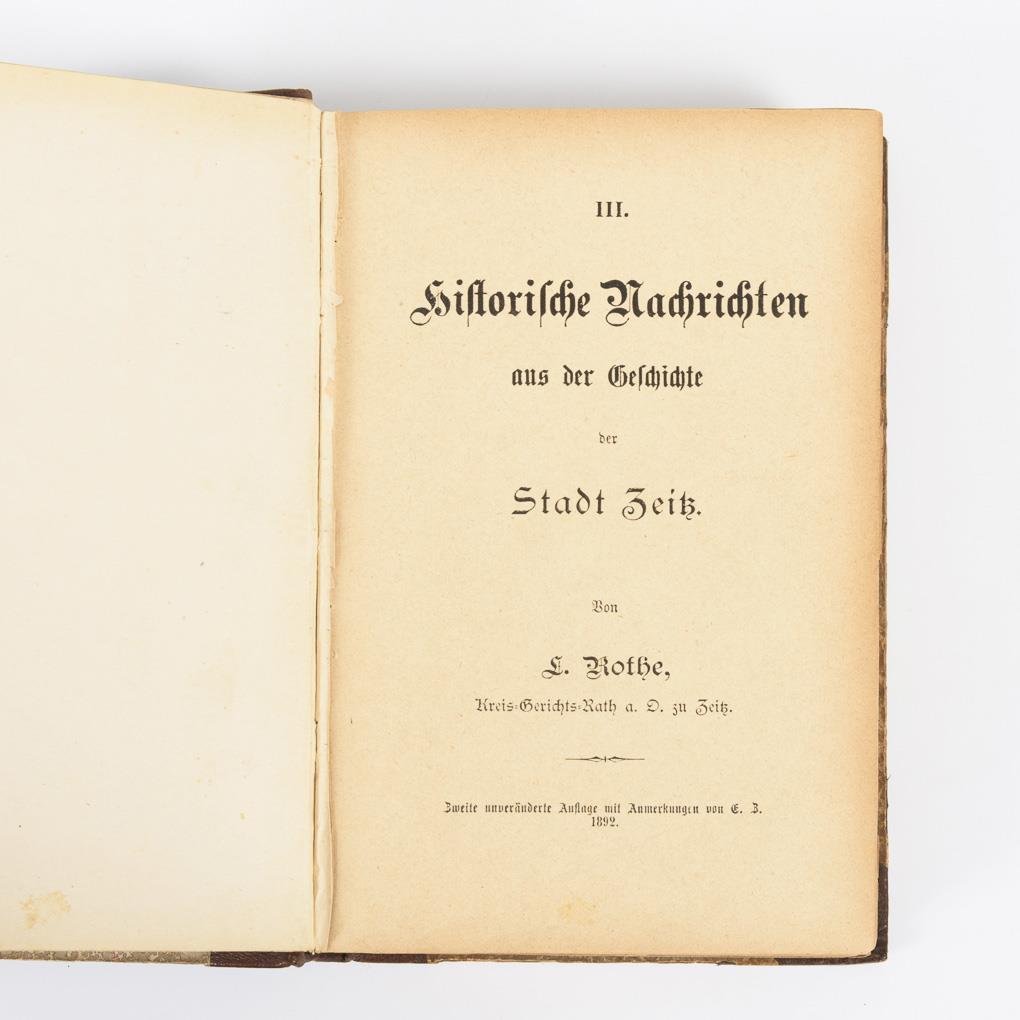 L. Rothe: "Historische Nachrichten aus der Geschichte der Stadt Zeitz", 1892, 2. unveränderte Auflage, 481 Seiten. / Ernst Zergiebel: "Geschichtliche Mittheilungen über die Stadt Zeitz und die Dörfer des Zeitzer Kreises ...". 1894. 580, 14 Seiten. Einheitlich in Halbleder gebunden und als Band 2 und 3 gekennzeichnet.