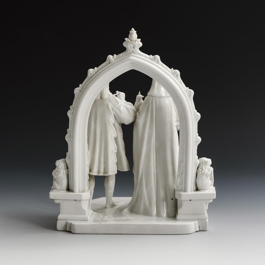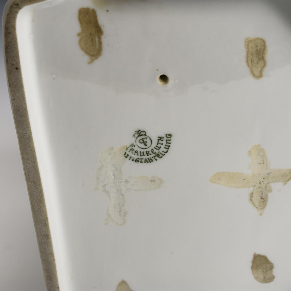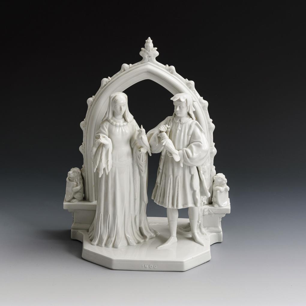 Entwurf wohl von Paul Berwinsky bzw. der eigenen Werkstatt. Vor einem gotischen Bogen stehendes Paar mit Falken. 2 kurze Brandrisse am Sockelrand, unterseitig Stützspuren.