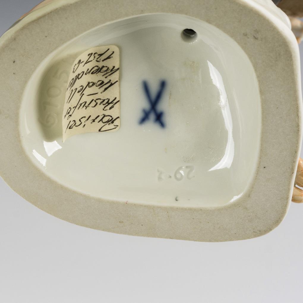 Entwurf von Johann Joachim Kaendler (1706 Dresden – 1775 Meißen) und Johann Friedrich Eberlein (1695 Dresden - 1749 Meißen). An einem Baumstamm mit Früchtekorb stehender junger Bauer.
