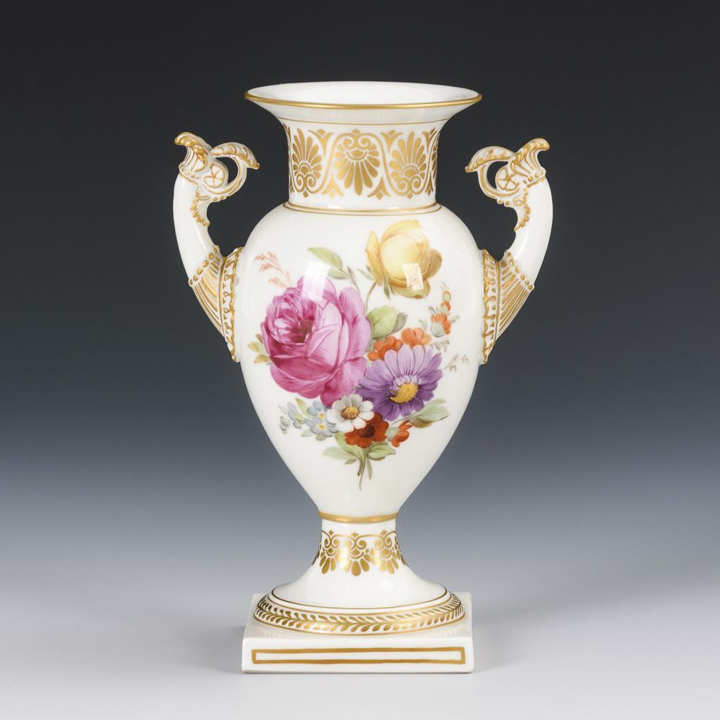 Ovoide Vase mit zwei Palmettenhandhaben, Kraterhals und Rundfuß, auf Quadratplinthe. Beidseitig ein gemaltes Blumenbukett, ornamentale Goldmalerei.