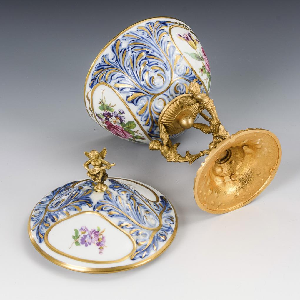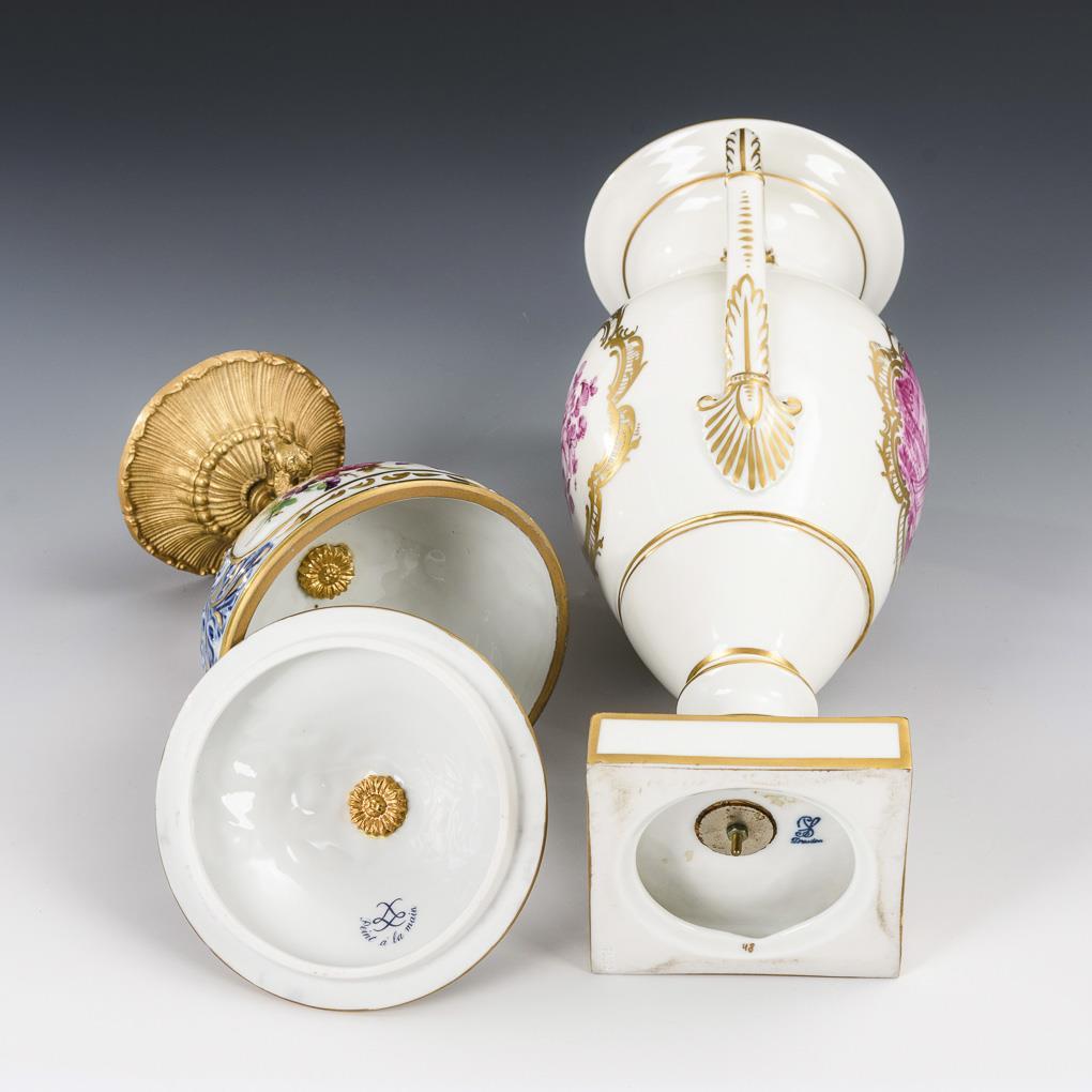 Vase Potschappel: Amphorenvase mit purpurfarbener Watteau- und Blumenmalerei und Goldstaffage. / Deckelgefäß Frankreich: mit unterglasurblau staffiertem Blattrelief und farbigem Blumendekor, Bronzemontierung mit Putten.