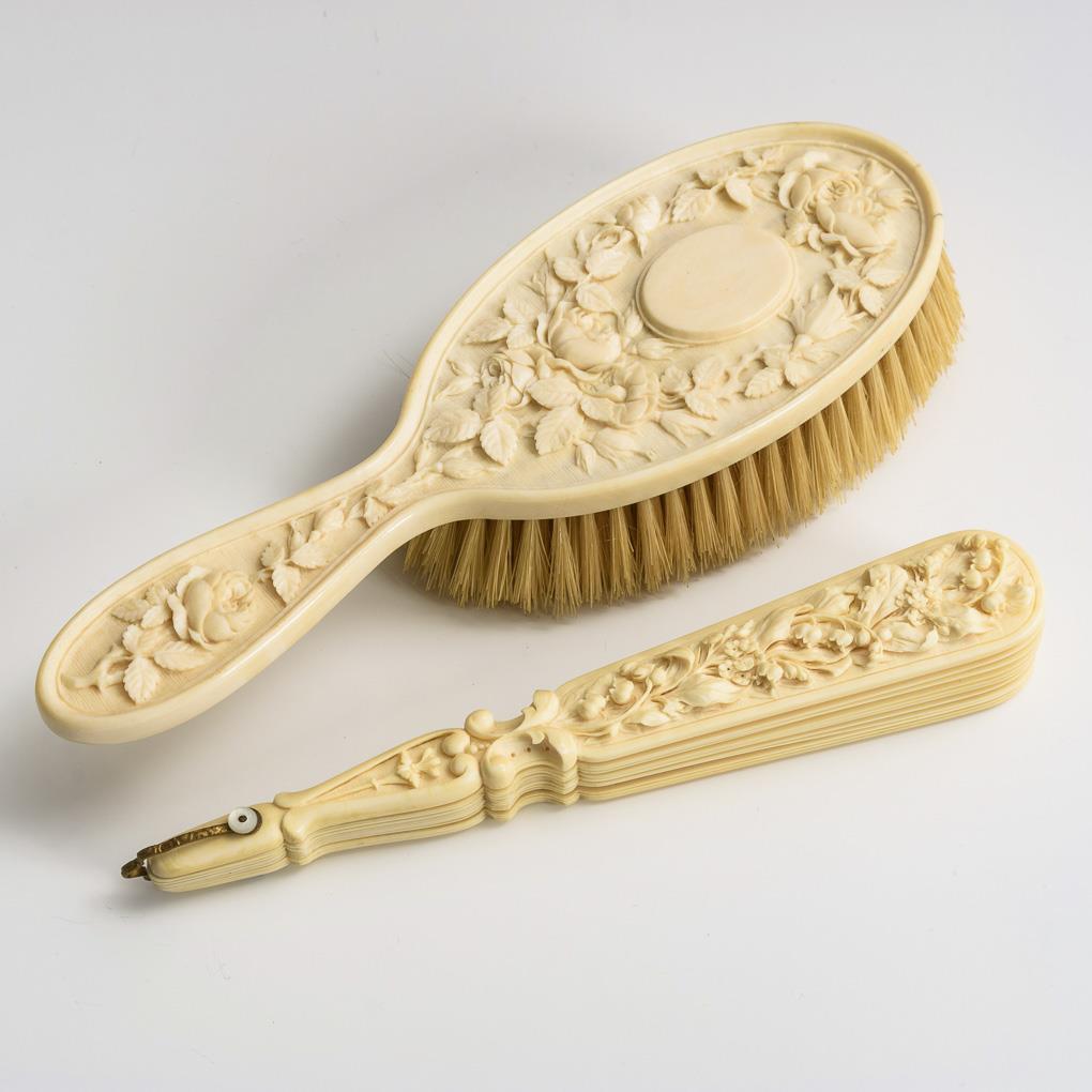 Große Bürste mit Rosenrelief und leerer Kartusche. Im schwarzen Etui Briséfächer mit Maiglöckchen-Hochrelief und Messingbügel. Bürste minimale Haarrisse.