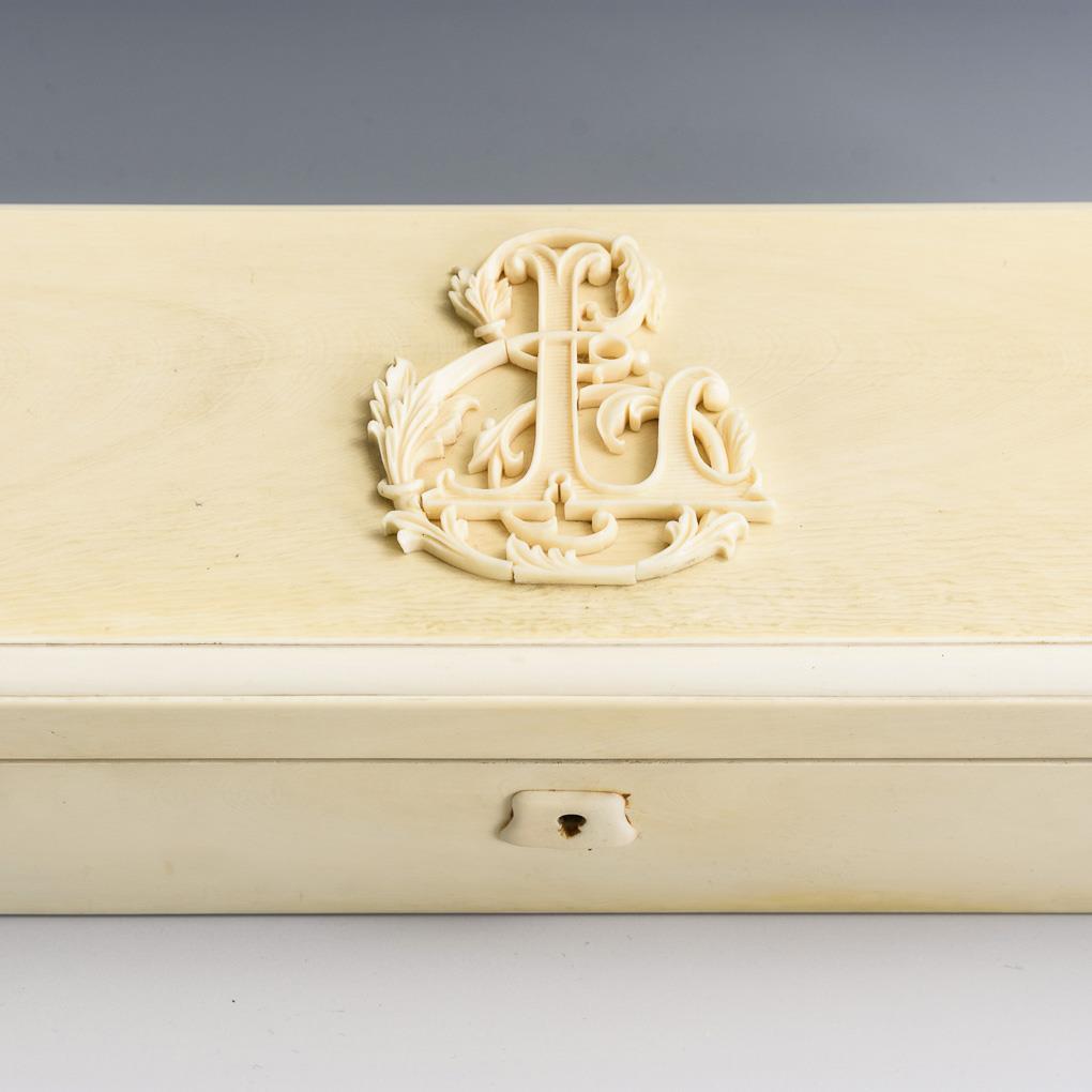 Holz , bis auf den Boden vollständig mit Elfenbein inkrustiert; innen blauer Samt. 8 x 30 x 10 cm.