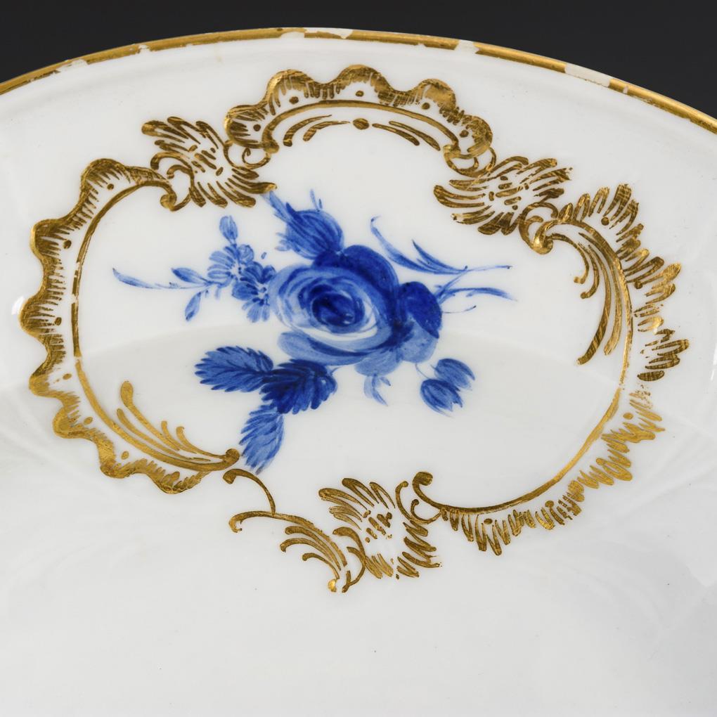 Form "Dulong". In vier Rocaillekartuschen unterglasurblaue Blumenbuketts, im Spiegel die Darstellung einer Landschaftsinsel mit Geflügel und Taube. Gold etwas berieben.