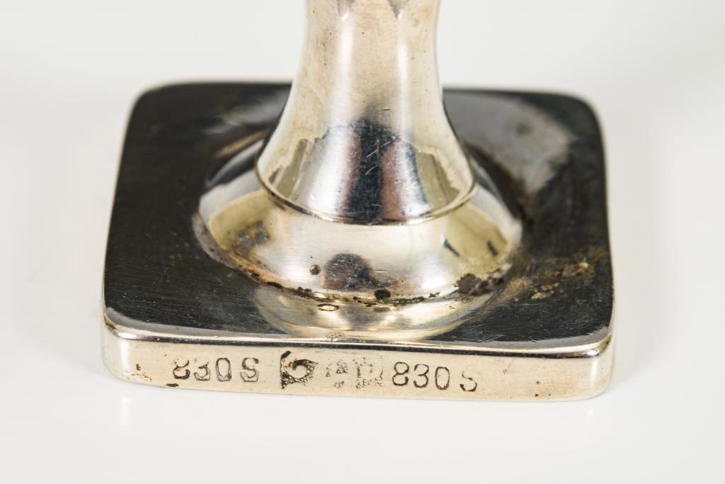 Floral reliefiertes Jugendstil-Teesieb mit figürlichem Griff. / Balusterförmiger Streuer mit Rosenrelief. / Kleiner glatter Streuer. Streuer minimal gedellt.