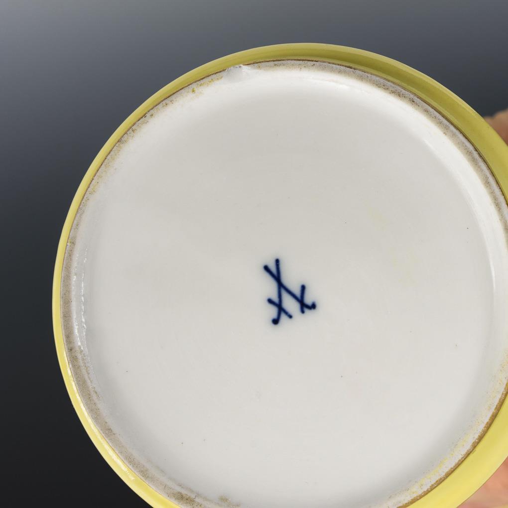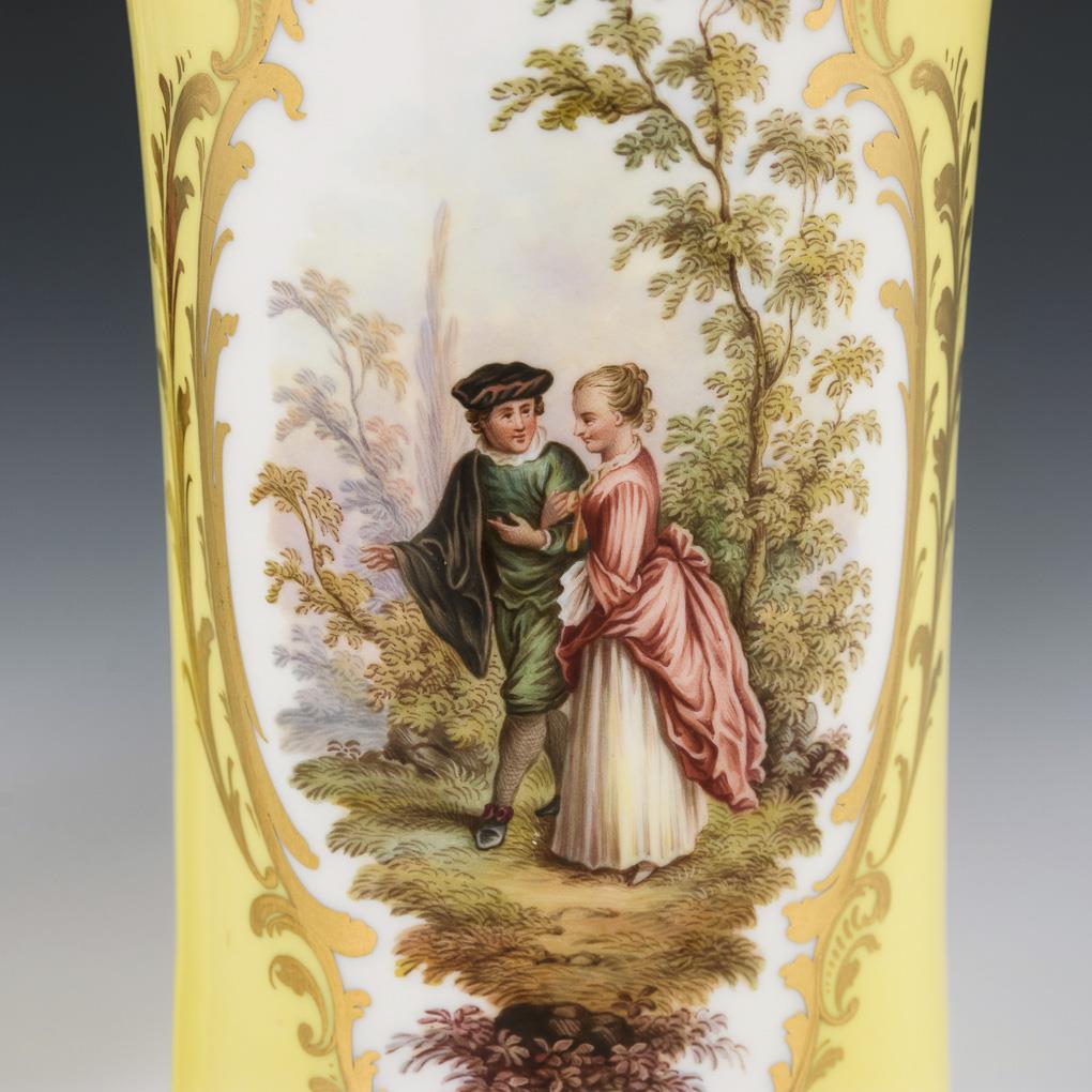 Flötenvasen mit zitronengelbem Fond. Beidseitig eine Vierpasskartusche mit einer galanten Szenen bzw. einem Blumenbukett. Gold partiell etwas berieben.