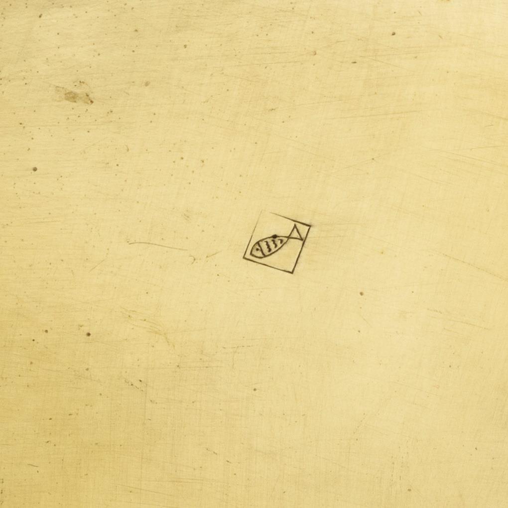 Martellierte und polierte Schale mit Bernstein-Spiegel sowie Wandhalterung. Geringe Alters-/Gebrauchsspuren.