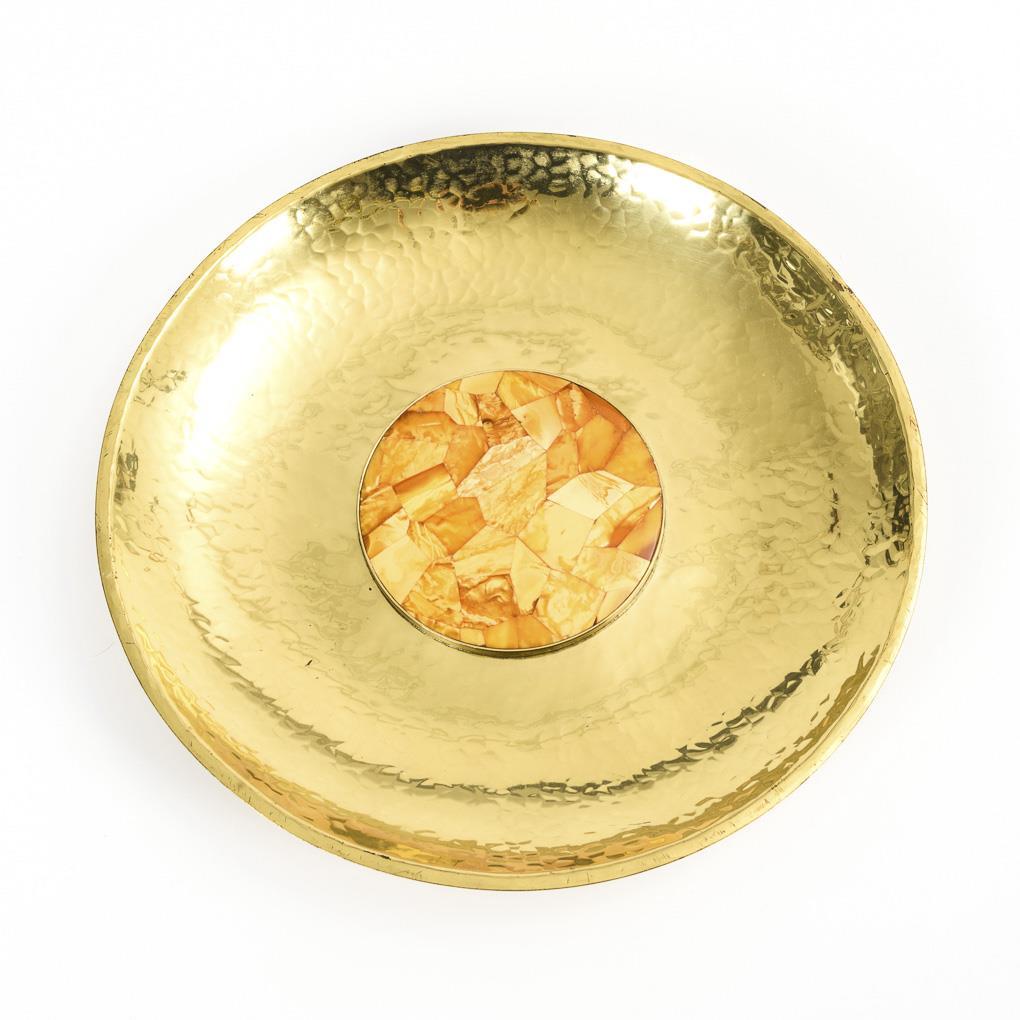 Messing martelliert, Bernstein. Ø 27,5 cm.